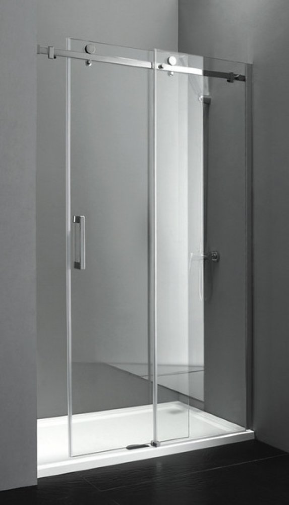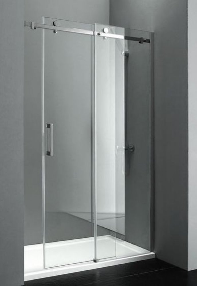 Dveře z bezpečnostního skla jsou zavěšeny a jejich pohyb usměrňuje vodící díl na podlaze. Je tak umožněn bezbariérový vstup.