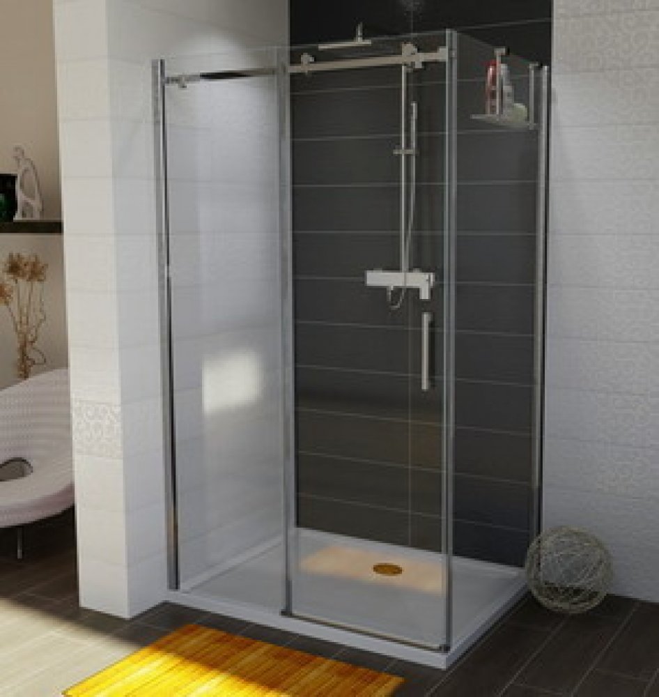 Vodící dílDveře z bezpečnostního skla jsou zavěšeny a jejich pohyb usměrňuje vodící díl na podlaze. Posuvné zástěny Dragon tak umožňují bezbariérový vstup.