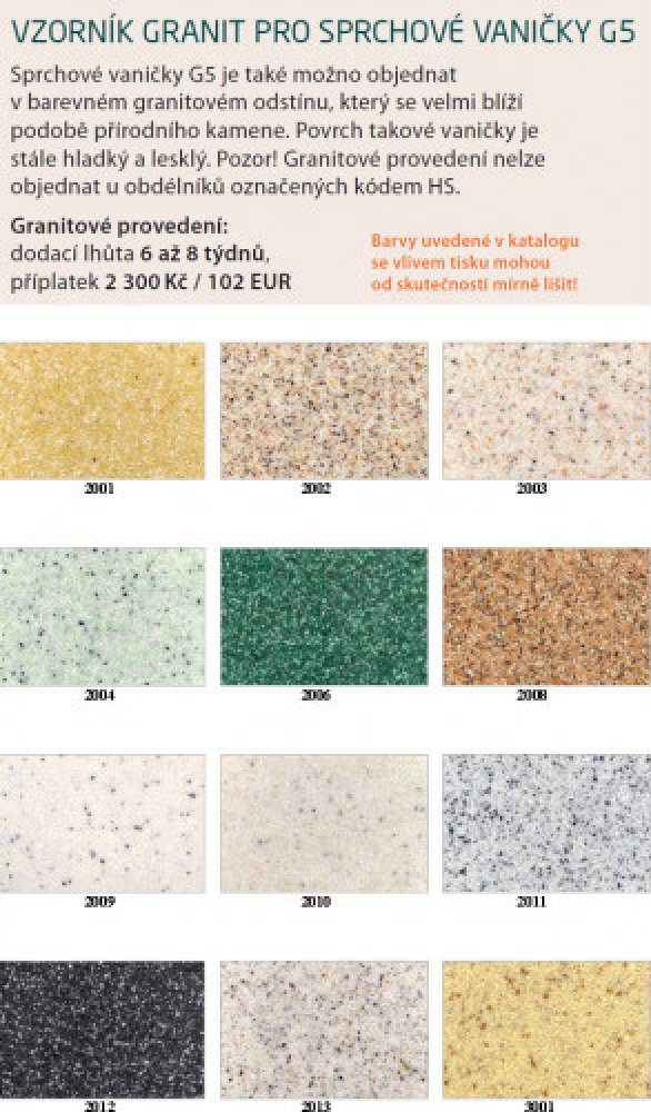 Sprchové vaničky G5 je také možno objednat v barevném granitovém odstínu, který se velmi blíží podobě přírodního kamene. Povrch takové vaničky je stále hladký a lesklý. Pozor! Granitové provedení nelze objednat u obdélníků označených kódem HS.