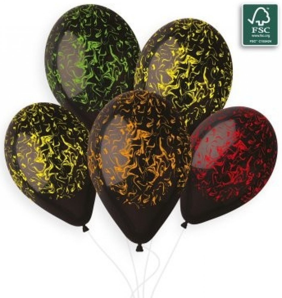 50ks černých balónků s potiskem neonového mramoru o průměru 33cm. Balóny Gemar jsou vyráběny výhradně v Itálii v souladu s národními a evropskými předpisy. Společnost Gemar úspěšně získala certifikát "100% MADE IN ITALY", který vydal Institut pro ochranu italských výrobců (ITPI www.madeinitaly.org), s nímž osvědčuje jako záruku spotřebitele skutečný původ a kvality italského produktu. Balíček je navržen tak, aby nabídl maximální flexibilitu při výběru produktů s jasnými a komplexními informacemi. Vyrábí se s recyklovatelnými materiály ve velkém formátu 100 kusů vhodných pro dekoratéry. Balónky Gemar latex jsou vyrobeny z přírodního kaučuku a jsou zcela biologicky rozložitešlné. Balónek začne proces rozkladu jakmile se nafoukne, vlivem světla a okolního prostředí. Za podobných okolních okolností se gumový balónek rozloží přibližně současně s javorovým listem.