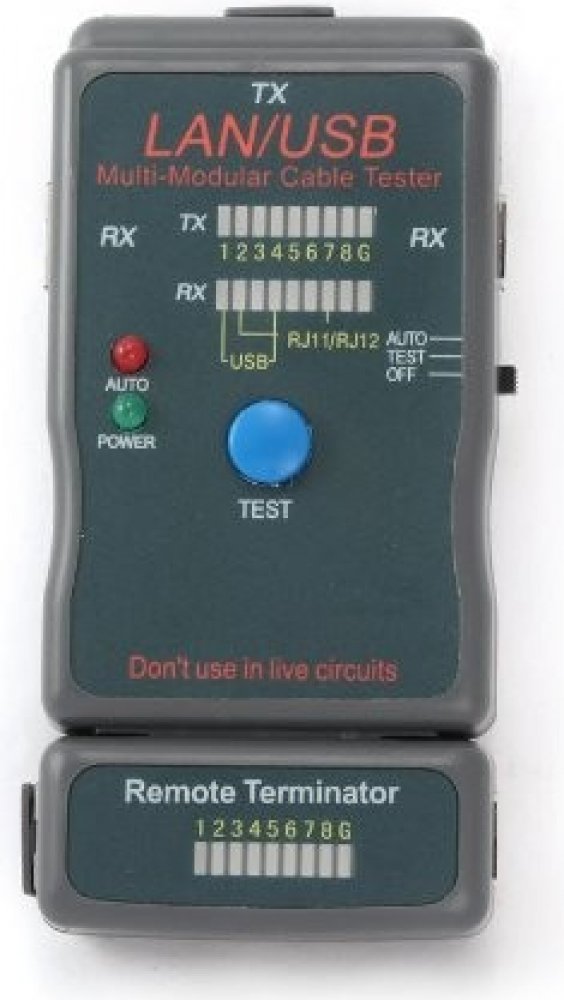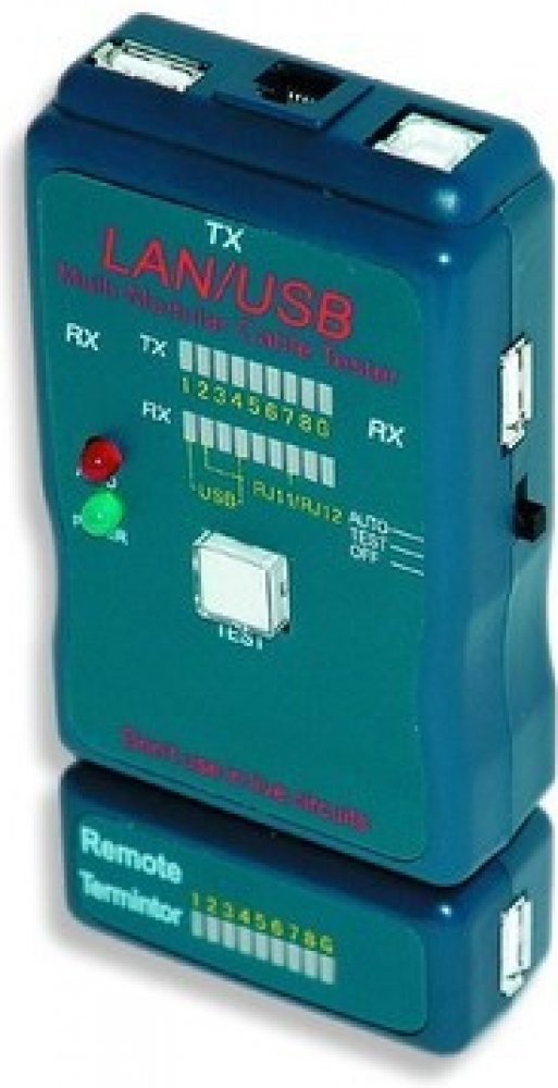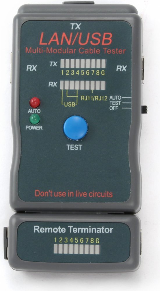 Testovač kabelů pro USB, STP, USB kabelyTestuje kabely rychle a lehceSpecifikace:Testuje: USB (A/A), USB (A/B), 100Base-TX, 1000Base-TX, Token Ring, EIA/TIA568A/568B and RJ11/TJ12 modulární kabelyObsah balení:* Multi-Modular cable tester* Dálkový terminátor* RJ11/TJ12 adaptéry - 2 kusy.