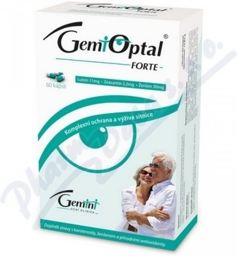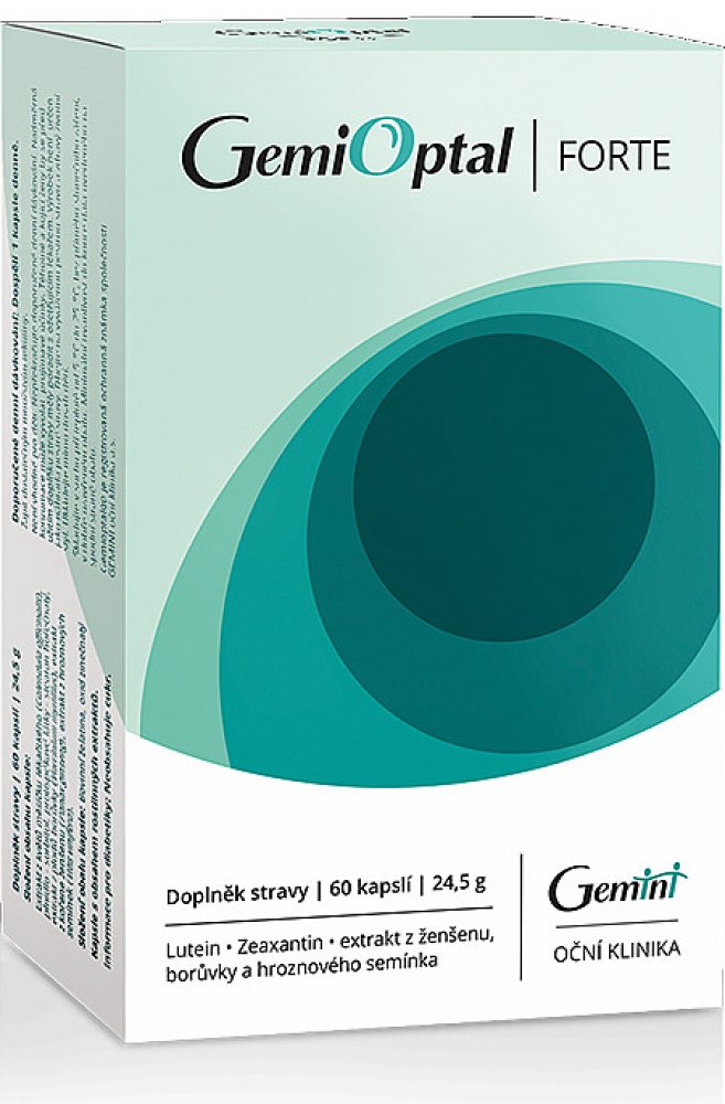Doplněk stravy - Kompletní výživa pro Vaše oči Přípravek Gemioptal® FORTE je doplněk stravy obsahující přírodní karotenoidy lutein a zeaxantin, získané z rostliny měsíčku lékařského, extrakt z borůvky a extrakt z hroznového semínka. Lutein a zeaxantin jsou základní stavební prvky sítnice a je potřeba je neustále doplňovat. Extrakt z borůvky a z hroznového semínka mají silné antioxidační účinky Žen...