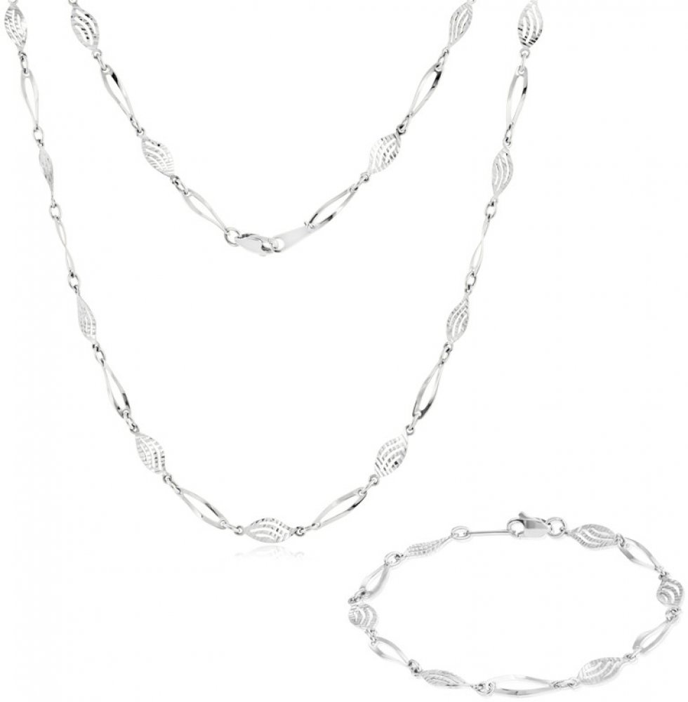 Krása soupravy náhrdelníku a náramku spočívá nejen v její trvalé hodnotě, či eleganci bílého zlata. Darujete tím šperky, které se mohou ve Vaší rodině dědit po generace. Souprava zlatých šperků ryzosti 14 karátů obsahuje náhrdelník a náramek. Skvostný design šperků kombinuje bílé zlato se třpytivým gravírováním. Tato souprava zlatých šperků zaručeně potěší každou ženu.