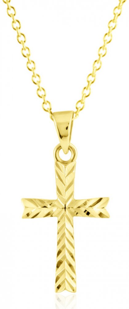Minimalistický křížek klínového tvaru Vás jistě okouzlí. Řetízek s přívěskem ze 14 karátového žlutého zlata krášlí hladká lesklá povrchová úprava na závěsném poutku a gravírování po celé lícní straně šperku, díky kterému se křížek na slunci krásně rozzáří. Tento šperk se může stát krásným dárkem k příležitosti Křtu, Prvního svatého přijímání či Biřmování.