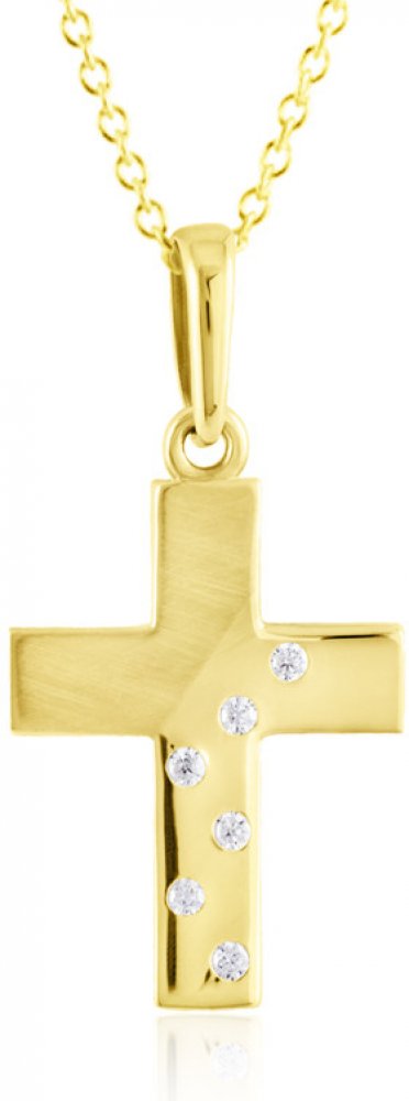 Kouzelný třpyt bílých zirkonů vyniká ve žlutém zlatě. Řetízek s přívěskem křížku ryzosti 14 karátů latinského tvaru krášlí zmatnění společně s hladkou lesklou povrchovou úpravou, do které jsou vsazeny třpytivé bílé zirkony briliantového brusu. Může se stát krásným dárkem k narozeninám, Vánocům, prvnímu svatému přijímání či svátosti biřmování.
