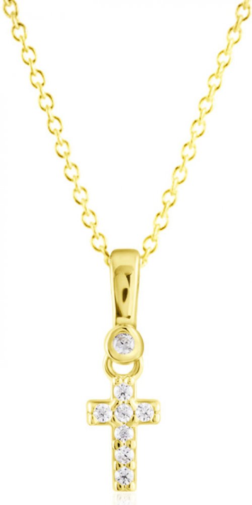 Okouzlující třpyt bílých zirkonů vyniká v kráse žlutého zlata. Řetízek s přívěskem křížku ryzosti 14 karátů, latinského tvaru krášlí linie bílých zirkonů briliantového brusu a lesklá povrchová úprava. Může se stát krásným dárkem ke křtu, prvnímu svatému přijímání či svátosti biřmování.