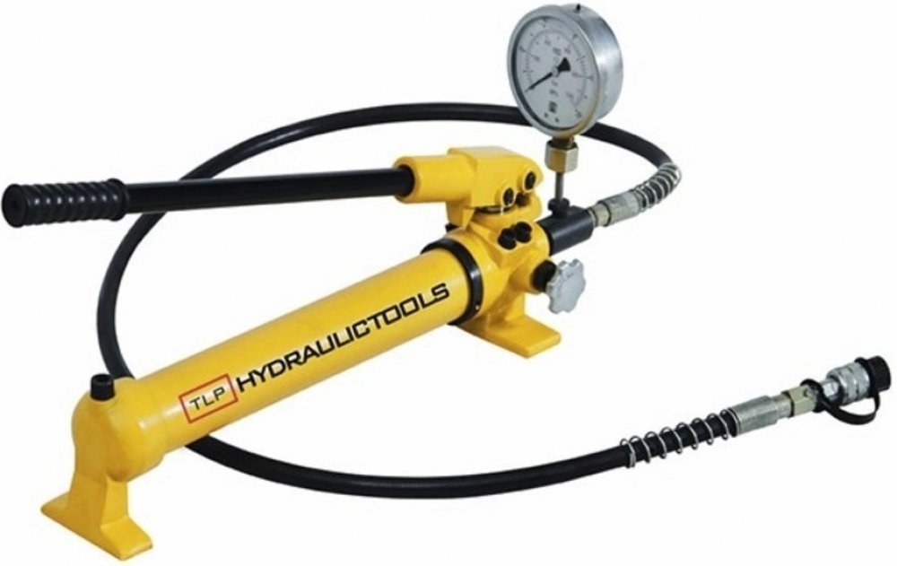 Ruční dvourychlostní hydraulická pumpa s ovládací pákou a přídavným manometrem, max. pracovní tlak 700 bar, hadice 180 cm – Genborx HHB-700B. Používá se pro pohon jednočinných hydraulických válců, různých hydraulických zařízení, rozpínáků, stahováků, hydraulických lisů, nůžek atd. Hlavní výhody: · robustní, kompaktní konstrukce · dvourychlostní funkce (rychlý pohon bez zátěže, pomalý pod zátěží) · krátká ovládací páka umožňuje použití i v omezeném prostoru · přídavný tlakoměr · vysokotlaká hadice s rychlospojkou R2 3/8“ s ochranným víčkem, délka 1,8 m · ventil ochrany proti přetížení · vysoká kvalita, provozní spolehlivost a dlouhá životnost Technické údaje: § Pracovní tlak: nízkotlaký 20 bar, vysokotlaký 700 bar § Množství čerpané kapaliny: nízkotlaký 13 cm3, vysokotlaký: 2,3 cm3 §