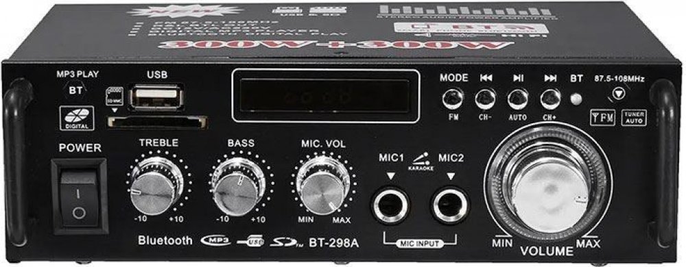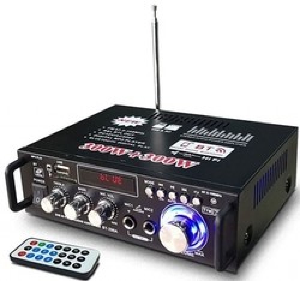 Univerzální přístroj s možností napájení 230VAC nebo 12–14VDC sdružující více funkcí. Nf zesilovač 2×80W, bluetooth, přehrávač MP3 (slot USB nebo SD), rádio FM, vše s dálkovým ovládáním. Technické parametry: - deklarovaný výstupní výkon: 2 × 80 W - odhadovaný výstupní výkon: 2 × 20 W / 4ohm - impedance připojených reproduktorů: 4–16 ohm - odstup s/š: >92dB - vstup line: citlivost 250 mV - vstup MIC: 2×, citlivost 2 mV – pro dynamický mikrofon - rádio: 87,5–108 MHz, 50 předvoleb - bluetooth 5