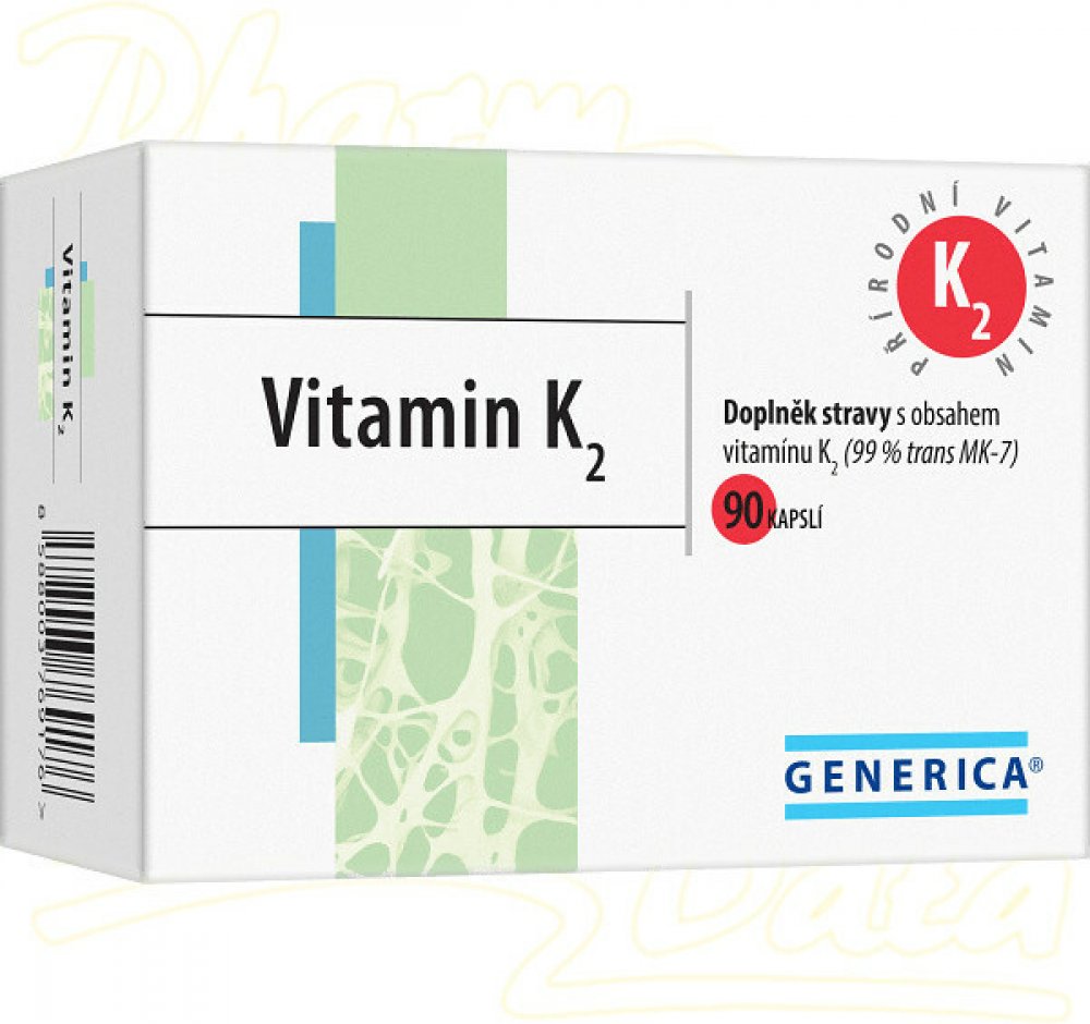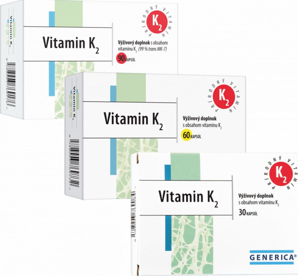 GENERICA Vitamin K2 je doplněk stravy obsahující přirozenou formu vitaminu K2, tzv. izomer MK-7, který se získává patentovaným biofermentačným procesem. Tato forma má lepší biologickou dostupnost a v krevním séru zůstává déle ve srovnání s jinými formami vitaminu K. Pro dosažení maximálního účinku v těle je MK-7 optimálním zdrojem vitaminu K2.