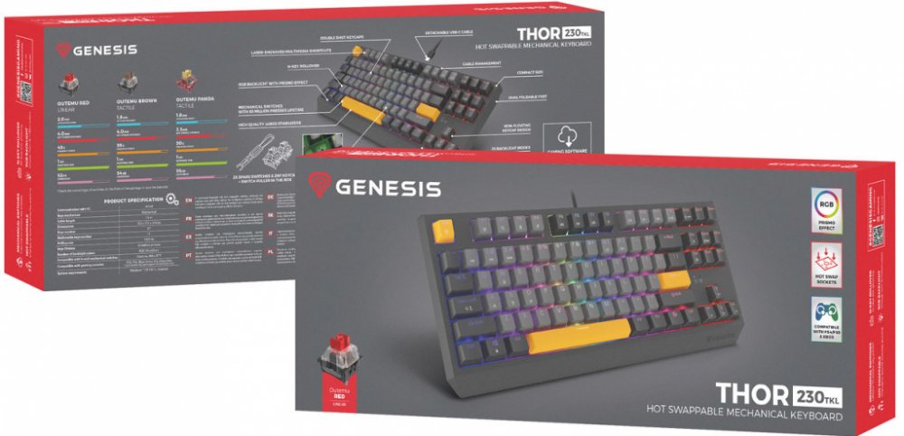 Klávesnici Genesis Thor 230 TKL jsme vybavili lineárními spínači Outemu Red, které vynikají vysokou přesností, aktivací bez ohledu na místo stisknutí klávesy a vysokou dynamikou. Víme však, že jako hráč můžete mít své vlastní preference. Proto jsme do Genesis Thor 230 TKL implementovali Hot Swap - techniku, která vám umožní nahradit jakýkoli třípinový mechanismus mikrospínačem od společností jako Outemu, Akko, KTT. Jednoduše vytáhněte nainstalovaný mechanismus a zapojte nový. Díky systému Hot Swap také nemusíte kupovat novou klávesnici, když jeden spínač selže. Vyměníte jej během několika sekund. Je to jednoduché.