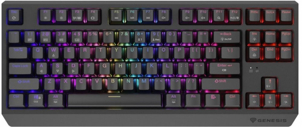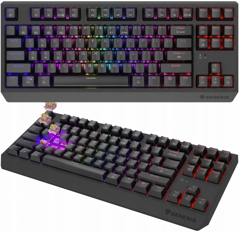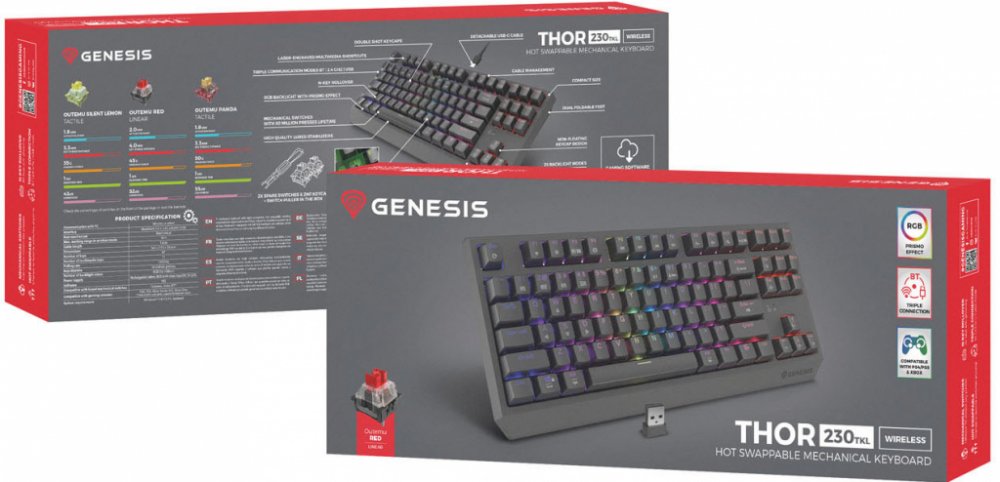 Klávesnice GENESIS Thor 230 TKL Wireless je vybavena různými typy spínačů. Každý z nich se vyznačuje vysokou přesností, aktivací bez ohledu na místo stisknutí klávesy a vysokou dynamikou. Víme však, že jako hráč můžete mít své vlastní preference. Proto jsme v GENESIS Thor 230 TKL Wireless implementovali hot - swap - techniku, která vám umožní vyměnit jakýkoli třípinový mechanismus za mikrospínač od společností jako Outemu, Akko, KTT. Jednoduše vytáhněte nainstalovaný mechanismus a zapojte nový. Díky systému Hot Swap také nemusíte kupovat novou klávesnici, když jeden spínač selže. Můžete jej vyměnit během několika sekund.