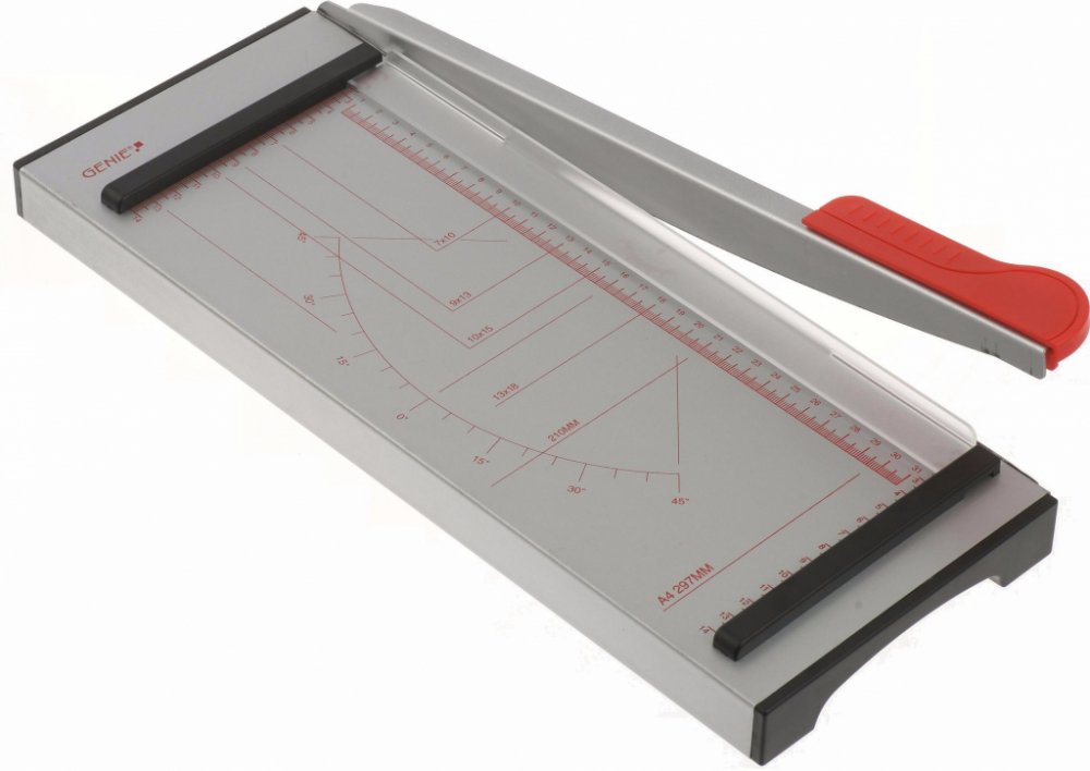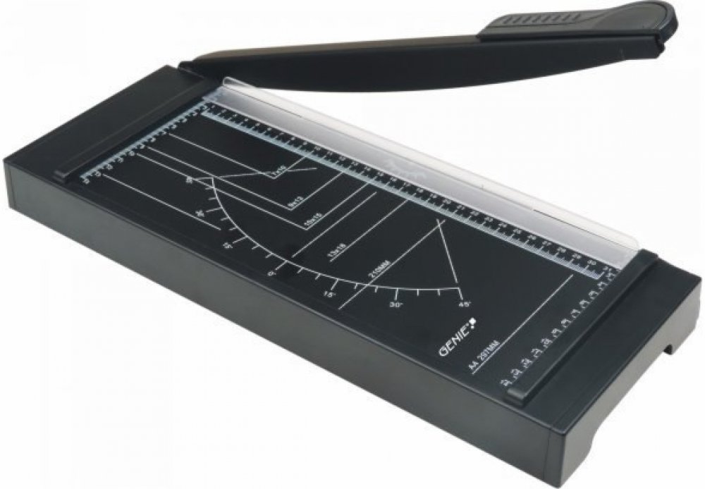 Páková řezačka Genie GH40 je ideální pro rychlé a precizní řezání papíru, fotek, kartiček apod. Odolný nůž uřízne až 6 listů standardního 80g papíru najednou a je osazen plastovou rukojetí. Při řezání pomáhá průhledná plastová přítlačná lišta, kterou si řezaný papír bezpečně přidržíte. Řezací plocha o rozměrech 400 x 150 mm je vyrobena z pevného kovu. Na ploše je naneseno několik vodítek, která usnadňují přesné řezání. Vodítka pro přesné řezání podél řezu a kolmo na řez (na obou stranách) - pravítko se stupnicí v centimetrech (nejmenší jednotka 1 milimetr) šablony formátů A4, A5, A6, A7 a fotografií 13 x 18 cm, 10 x 15 cm, 9 x 13 cm a 7 x 10 cm Specifikace Formát / délka řezu: A4 (délka řezu 297 až 419 mm) Kapacita řezání: 6 listů Funkce: rovný řez Velikost pracovní desky: 400 x 150 mm Hmotnost: 0,89 kg Rozměry: 415 x 190 x 40 mm