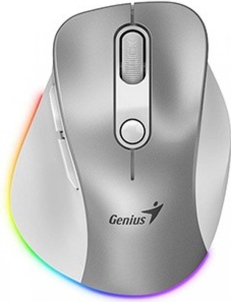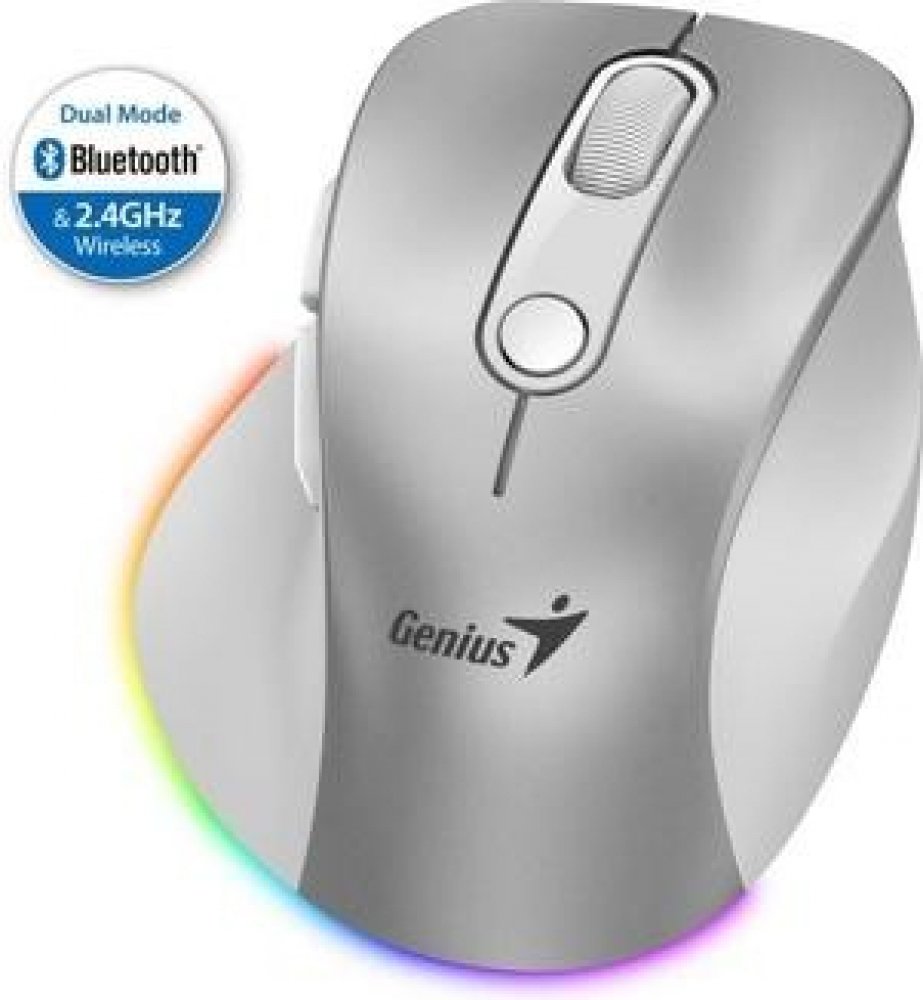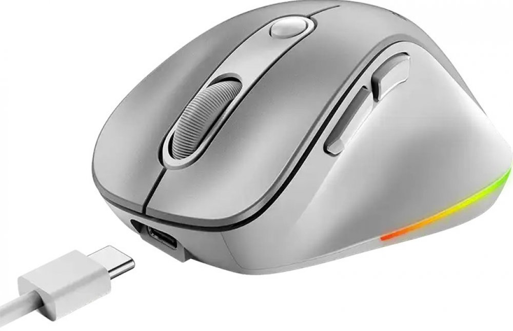 Bezdrátová, ergonomická a tichá myš; 7barevné RGB podsvícení; Podporuje připojení k více zařízením (Bluetooth BT1, Bluetooth BT2 a 2.4 GHz); Dosah připojení až 10 m; Vypínač "Power" pro úsporu energie; DPI přepínač; Součástí balení je USB na USB-C kabel. ZÁKLADNÍ SPECIFIKACE; Typ myši: optická; Počet tlačítek: 6; Rozlišení: 800/1200/1600/2400 DPI; Rozhraní: 2,4 GHz (USB adaptér), Bluetooth 5.0, USB-C (nabíjení); Napájení: integrovaná dobíjecí baterie; Rozměry: 90,7 × 68,2 × 39,3 mm; Hmotnost: 65 g; Barva: stříbrná