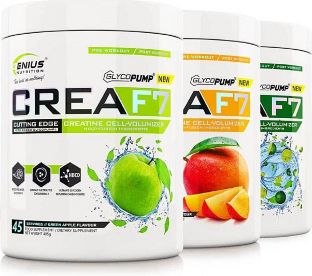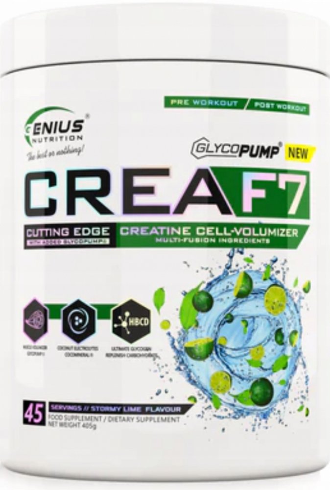 Crea-F7 od Genius nutrition je sofistikovaná směs 6 druhů kreatinů doplněná o glycerolovou infúzi a regenerační složku z kokosového mléka