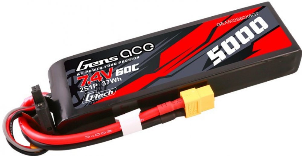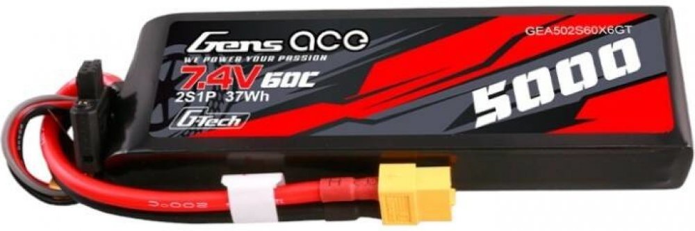 ManufacturerGens AceModelGEA502S60X6GTCapacity5000mAhVoltage7.4V (2s)Maximum continuous discharge60CMaximum impulse discharge100CWeight247gDimensions133x42x20mmRecommended charging speed1-3C