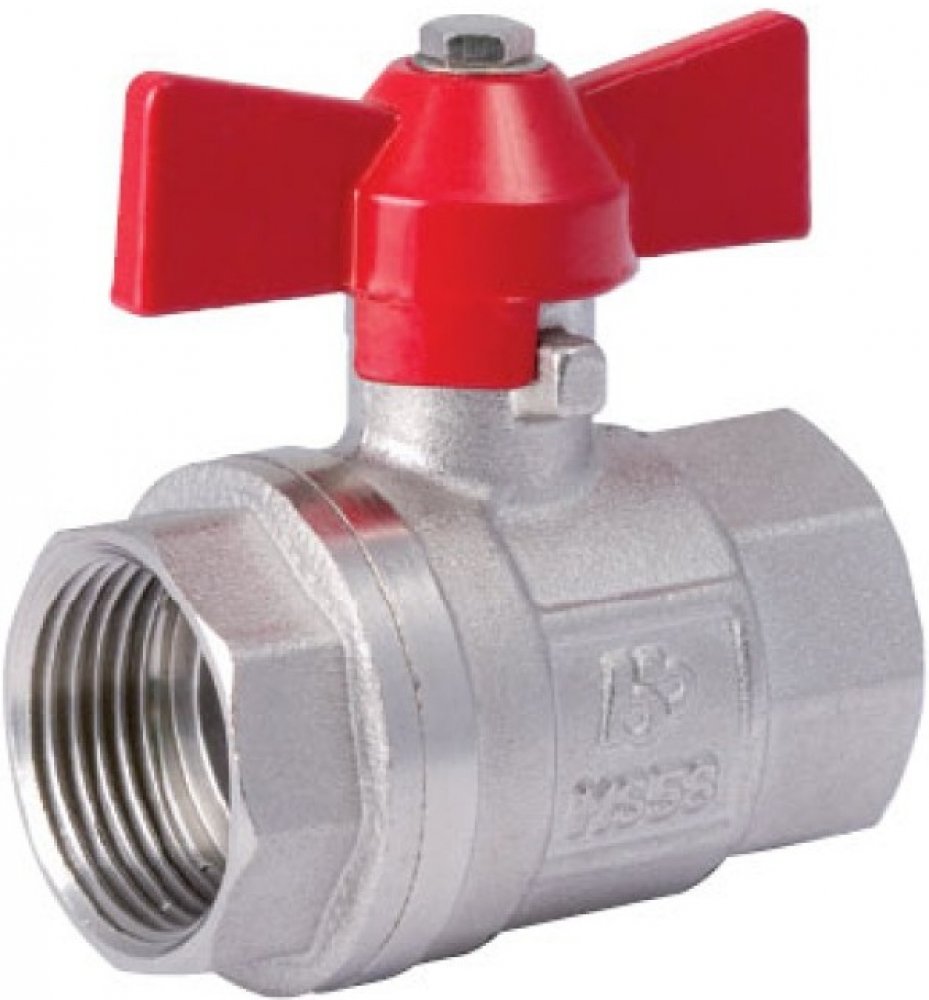 Kulový kohout s vnitřním a vnějším závitem, ovládání páčkou.Tělo, závitová část a koule z mosazi MS 58, ovládací páčka v červené barvě. Utěsnění hřídele pomocí ucpávky. Určeno zejména pro rozvody vody v průmyslu, řemeslnictví a domácnostech.
