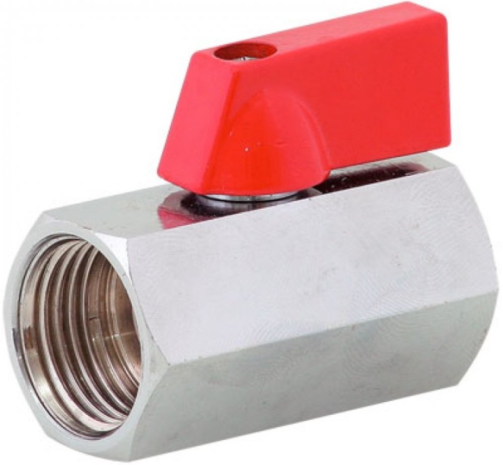 Šestihranný kulový kohout s vnitřními závity. Tělo z poniklované mosazi, páčka z plastu, koule z chromované mosazi a těsnění PTFE. Pro přípoje stlačeného vzduchu v průmyslu, stavebnictví a domácnostech, rovněž vhodné pro rozvody vody.