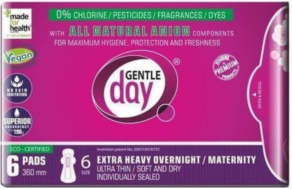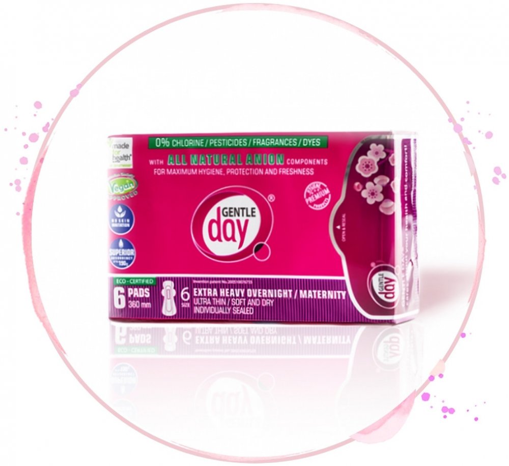 Gentle Day Extra absorpční poporodní vložky 6 ks Porodnické vložky s aniontovým proužkem vyrobené z přírodních složek, které mají antibakteriální účinky a jsou netoxické. Vložky byly navrženy pro ženy, které mají extrémně silnou menstruaci, a doporučují se pro použití po porodu.