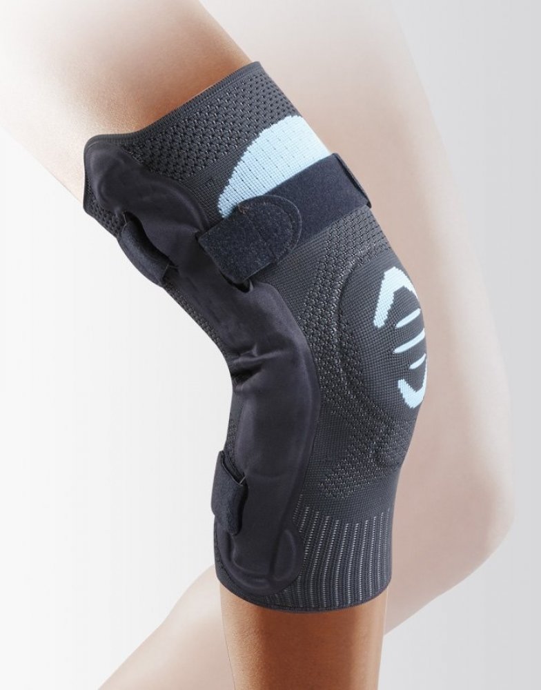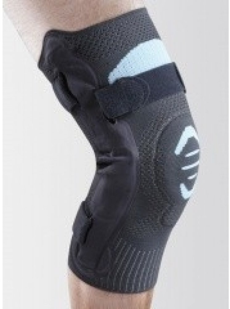 Kolenní ortéza s dvouosým kloubem, se silikonovou vložkou okolo čéšky pro podporu její stabilizace, s protiskluzovými vlákny v horním okraji ortézy a fixačními pásky na obou koncích proti rotaci ortézy. Popis výrobku