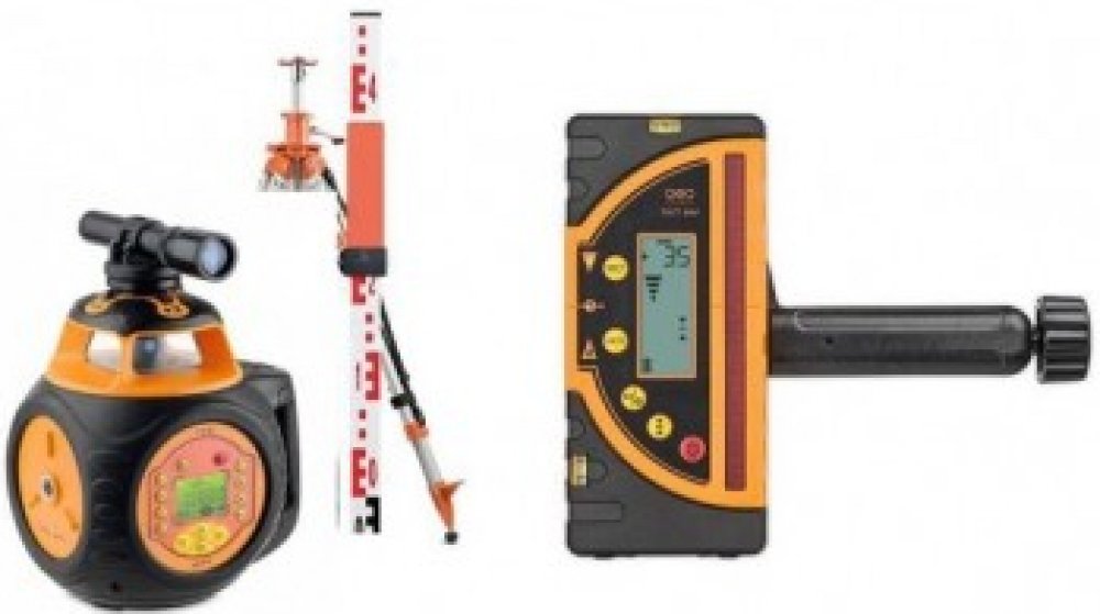 FL 510HV-G Tracking, přijímač laseru FR 77-MM Tracking s úchytem na lať nebo lešení, dálkové ovládání, inteligentní nabíječku / zdroj, vertikální držák, přídavný optický hledáček, transportní plastový kufr