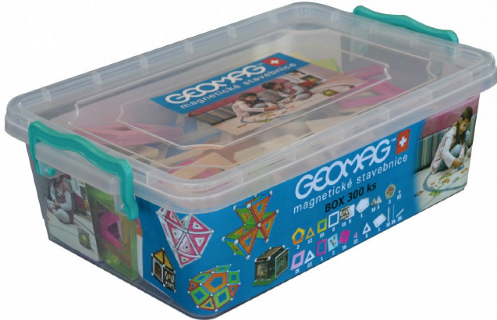 GEOMAG Box Supercolor 300 ks - je větší pestrobarevné balení stavebnice Geomag Classic panels, obsahuje 108 mag. tyček, 80 kuliček, 108 panelů (trojúhelníky, čtverce a pětiúhelníky) a 5 stavebních podložek (3x čtverec, 2x pětiúhelník). Pestrobarevná stavebnice je uložená v praktickém uzavíratelném boxu.