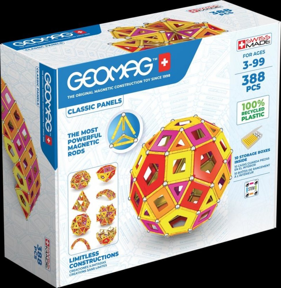 Geomag Classic Panels: Master Box Warm - ekologická konstrukční barevná magnetická 2D / 3D kvalitní stavebnice z kovu a plastu. Velké maxi balení 388 dílků v teplých odstínech.