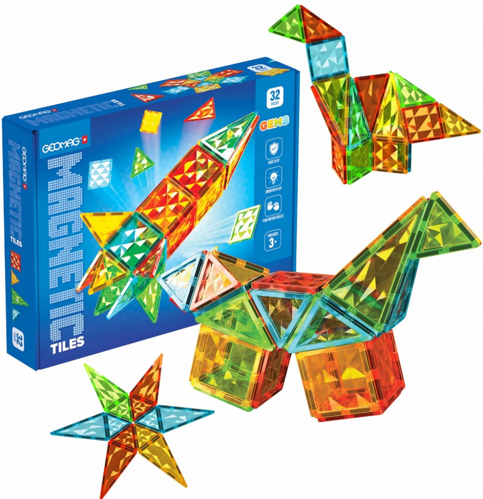 Geomag Gems Rocket 32 magnetických dlaždicGeomag Gems Rocket 32 je sada magnetických destiček, která umožňuje dětem kreativně stavět stavby inspirované vesmírnými dobrodružstvími. Díky 32 barevným dílkům s lesklou fasetovou strukturou ve tvaru trojúhelníku a čtverce mohou malí konstruktéři stavět působivé rakety, vesmírné lodě a mnoho dalších prostorových útvarů. Každý dílek se spojuje pomocí magnetů, což usnadňuje stavění a podporuje experimentování s tvary a principy rovnováhy. Hračka podporuje rozvoj jemné motoriky, prostorové představivosti a logického myšlení a zároveň uvádí děti do světa STEM (věda, technologie, inženýrství a matematika). Je vhodná pro děti od 3 let a je určena pro bezpečnou hru. VýrobceGeomagKód výrobce4105Počet prvků v sadě32Věk3+
