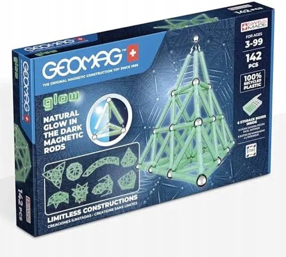 Největší Glow stavebnice Geomag. Obsahuje 68 svítivých magnetických tyček, 68 ocelových kuliček, 3 čtvercové podstavce a 3 pětiúhelníkové podstavce. Celkem 142 dílků. Baleno v praktických úložných pouzdrech.