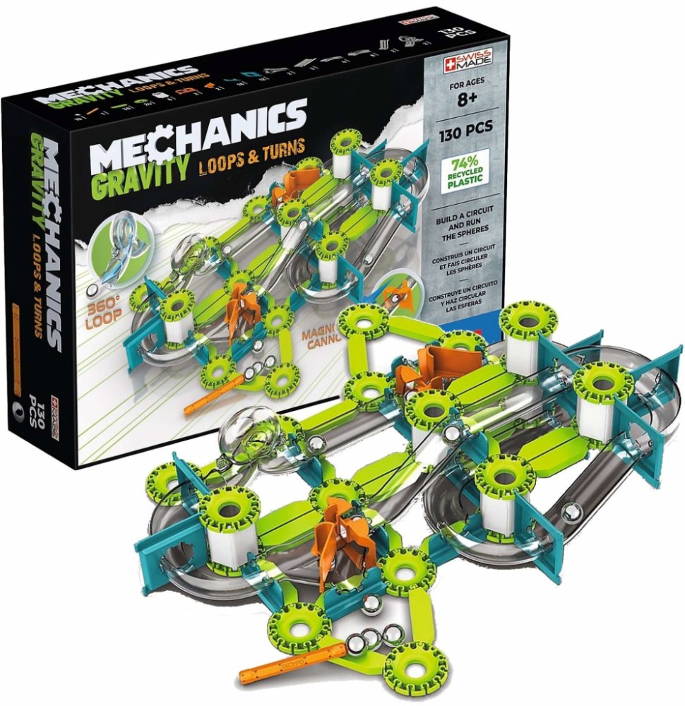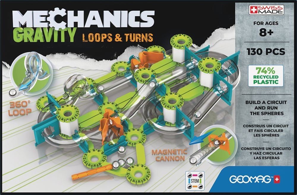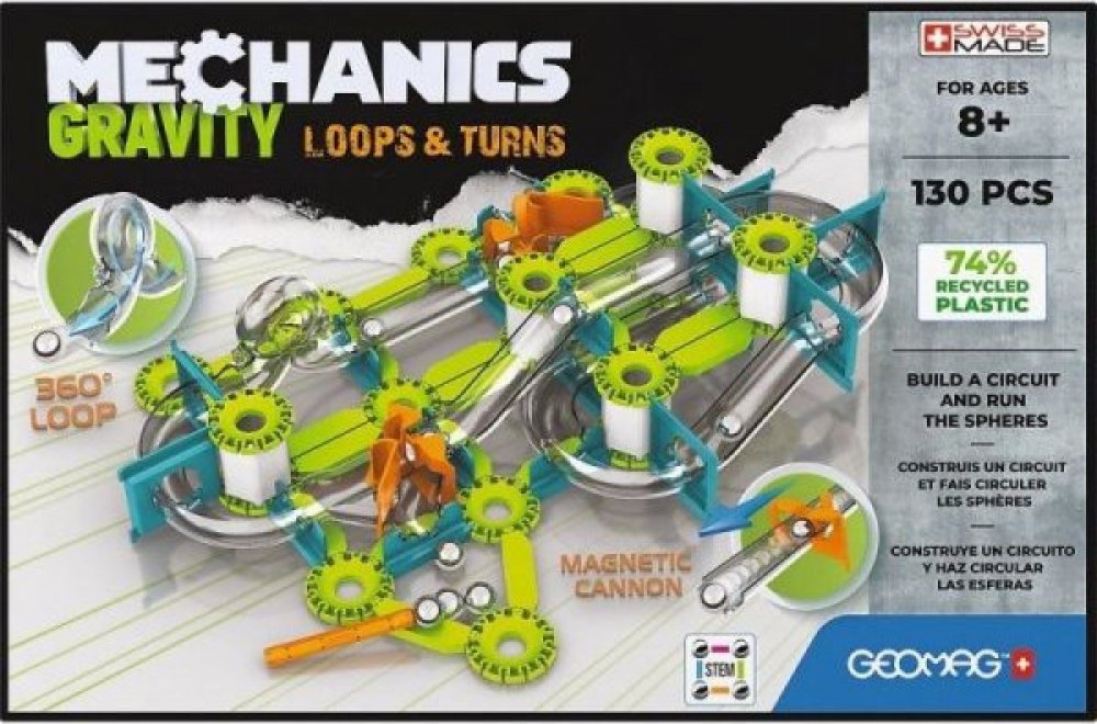 Geomag Mechanics Gravity Loops & Turns otevírá malým inženýrům svět dynamické hry s využitím skutečných fyzikálních jevů. Tato 130dílná sada umožňuje dětem od 8 let stavět jedinečné dráhy pro malé kuličky, které využívají magnetismus a gravitaci k vytváření velkolepých efektů a podporují učení prostřednictvím praktických zkušeností.