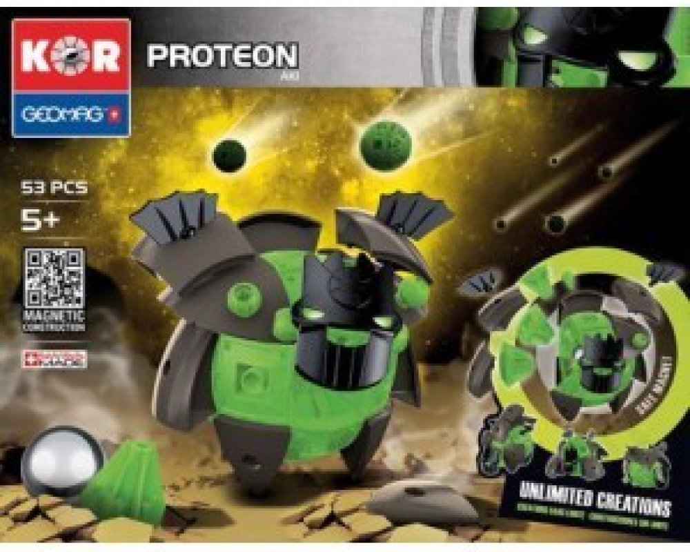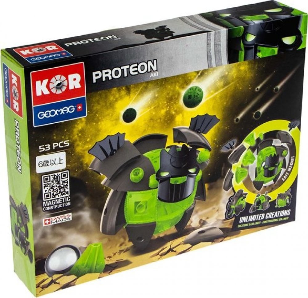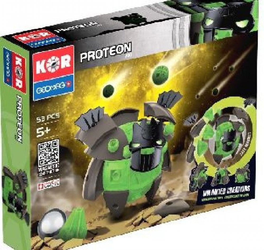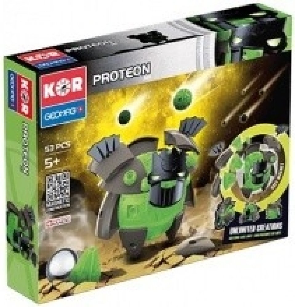 Řada stavebnic GEOMAG KOR je nový magnetický konstrukční systém, který vám umožní vytvořit velký počet typů robotů. Když PROTEONI přistáli na Zemi, okamžitě se začali vyvíjet a měnit podle druhu prostředí, ve kterém přistáli. Sopky, bažiny i tvrdé skály dali Proteonům různé charaktery a techniky boje. Využijte konstrukčních možností a vytvářejte stále nové a silnější postavy!