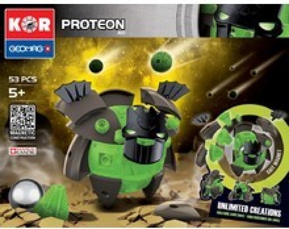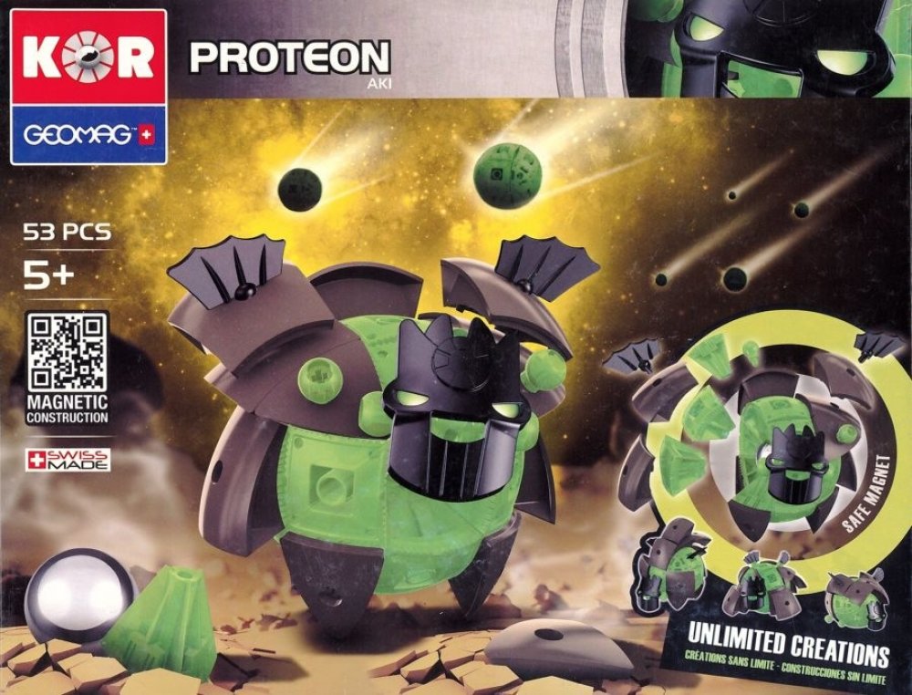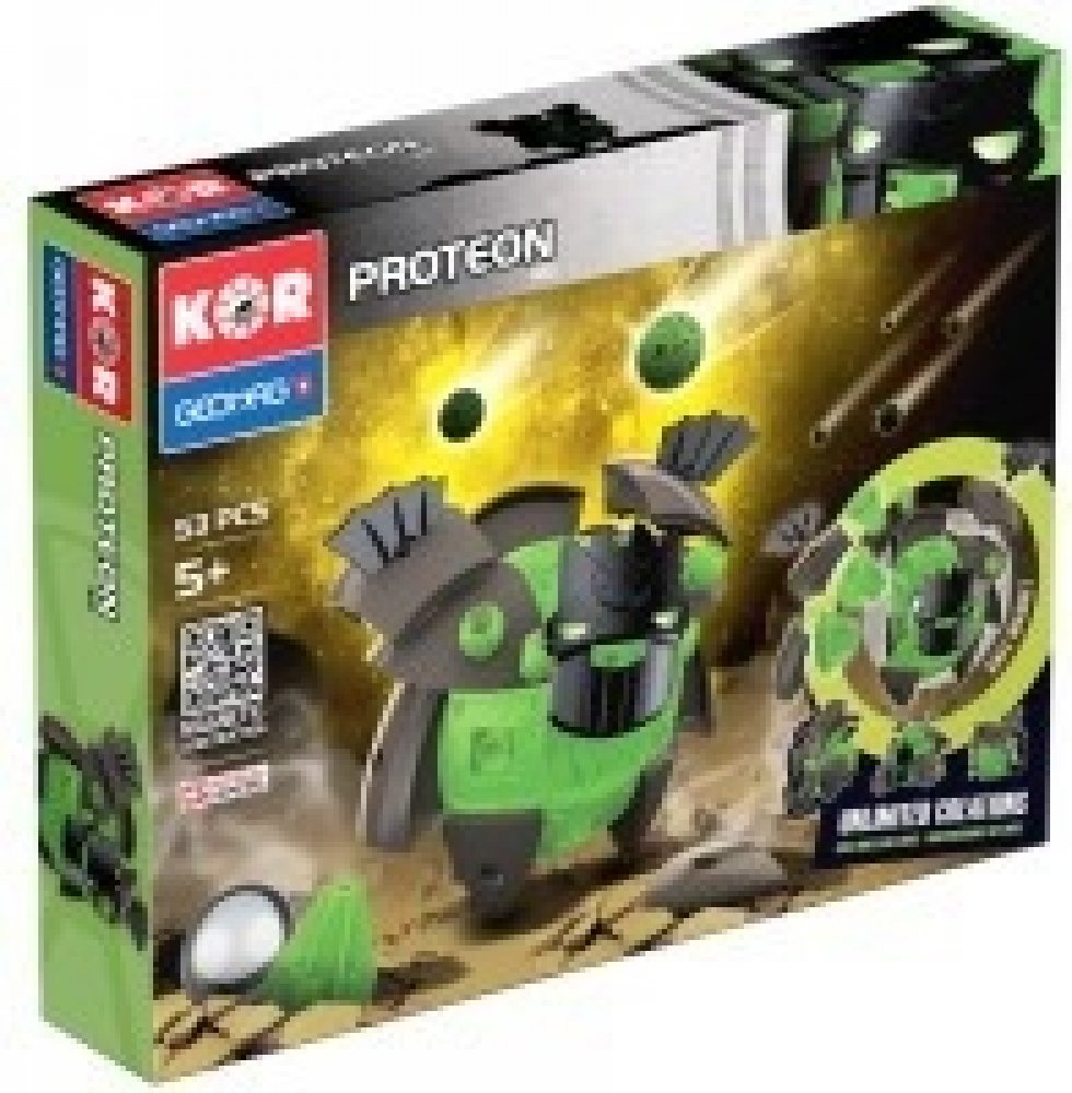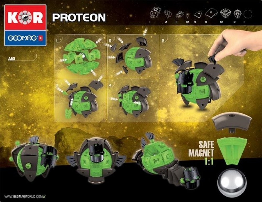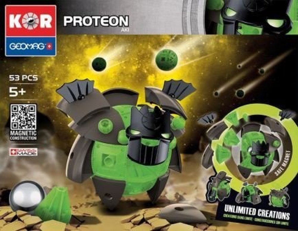 Řada stavebnic GEOMAG KOR je nový magnetický konstrukční systém, který vám umožní vytvořit velký počet typů robotů. Když PROTEONI přistáli na Zemi, okamžitě se začali vyvíjet a měnit podle druhu prostředí, ve kterém přistáli. Sopky, bažiny i tvrdé skály dali Proteonům různé charaktery a techniky boje. Využijte konstrukčních možností a vytvářejte stále nové a silnější postavy!
