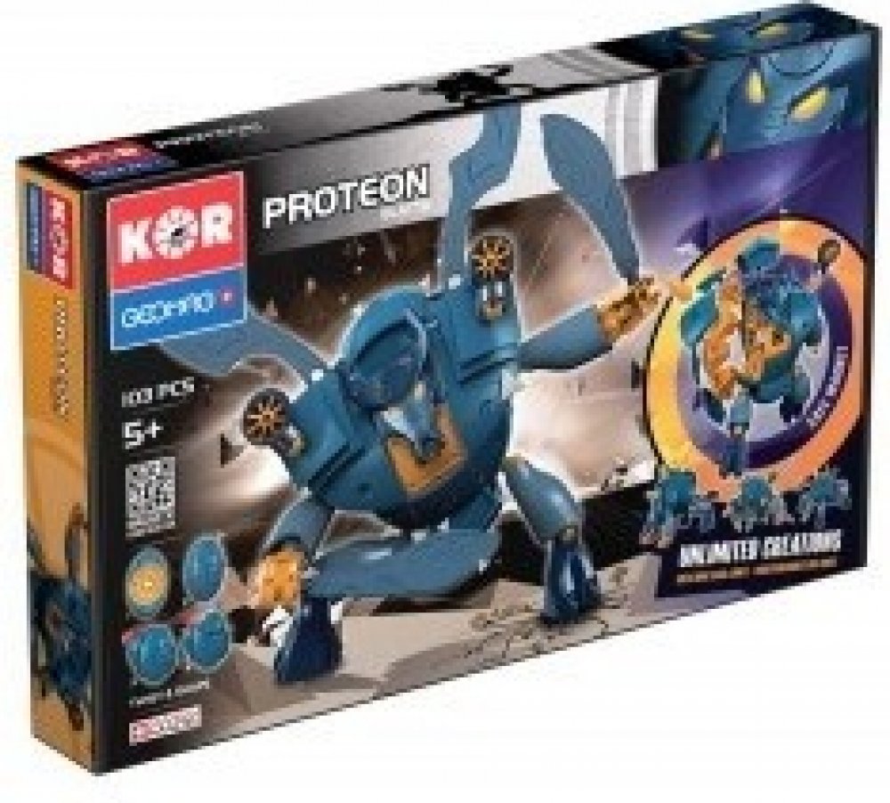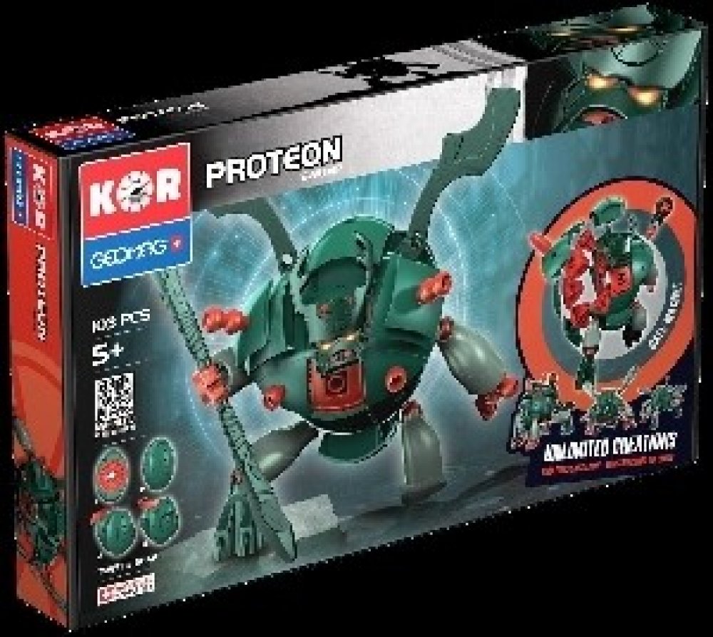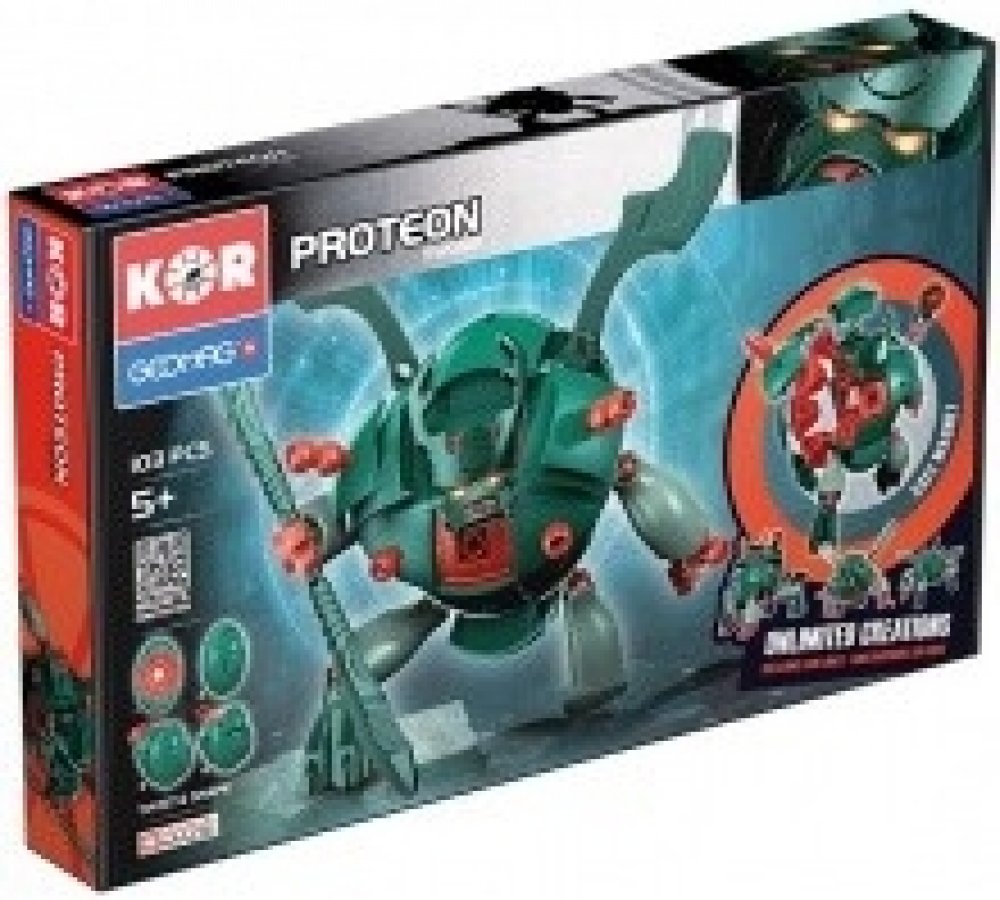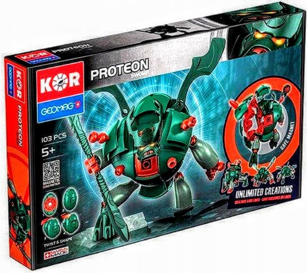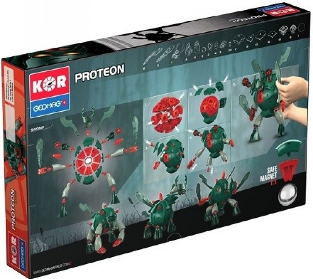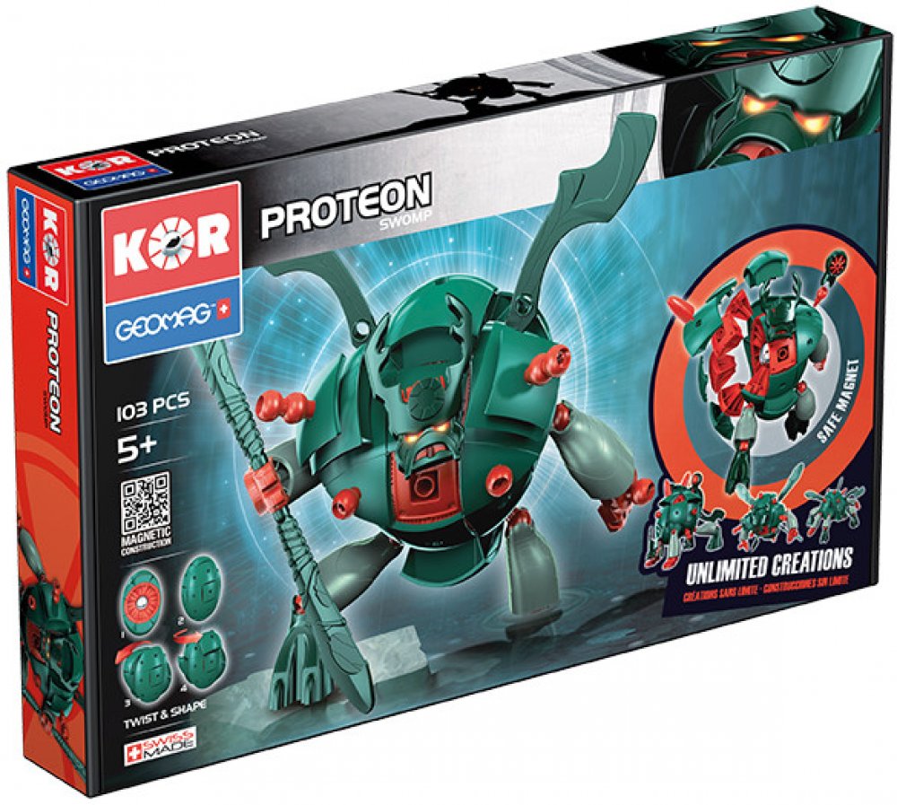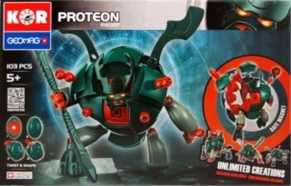 Zeleno -červený Proteon Swomp - vládce bažin a močálů. Stavebnice Geomag KOR Proteon Swomp obsahuje velkou ocelovou kuličku, kolem které jsou soustředěny ostatní plastové díly (obsahující magnety). Vše drží pohromadě magnetickou silou a tvoří tak základní eliptickou kouli KOR Proteonu. Otáčením dílů kolem ocelového středu lze dostat nespočet variant vzhledu KOR Proteonu.