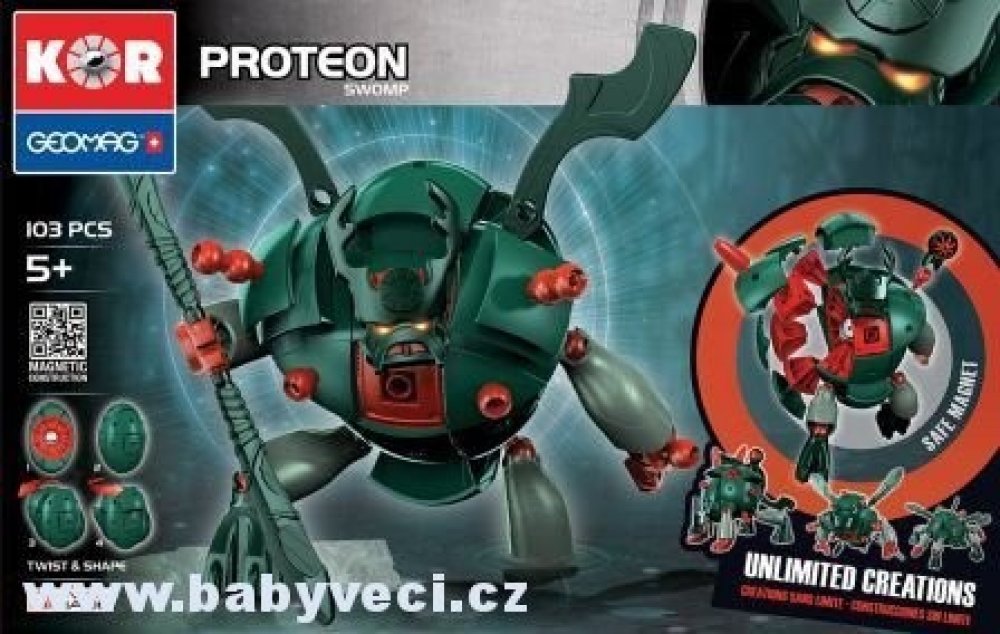 Zeleno -červený Proteon Swomp - vládce bažin a močálů. Stavebnice Geomag KOR Proteon Swomp obsahuje velkou ocelovou kuličku, kolem které jsou soustředěny ostatní plastové díly (obsahující magnety). Vše drží pohromadě magnetickou silou a tvoří tak základní eliptickou kouli KOR Proteonu. Otáčením dílů kolem ocelového středu lze dostat nespočet va...