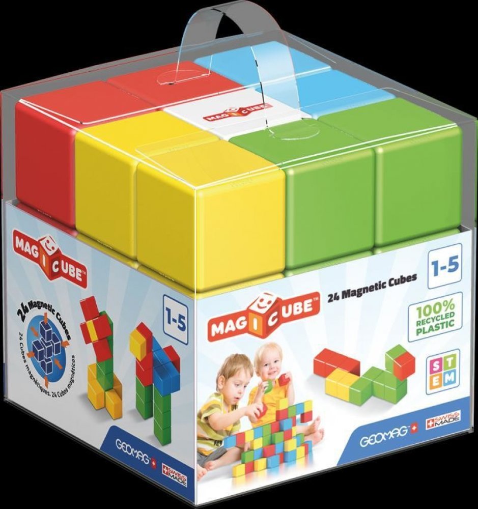 Vítejte ve světě Magicube Color Recycled Crystal od společnosti Geomag, kde mohou i ty nejmenší děti vytvářet rozmanité, originální stavby. Tato sada 24 barevných magnetických kostek je ideální pro malé ručičky - byla vytvořena pro batolata již od 1 roku. Přiložené prvky jsou navíc vyrobeny z recyklovaného plastu šetrného k životnímu prostředí.
