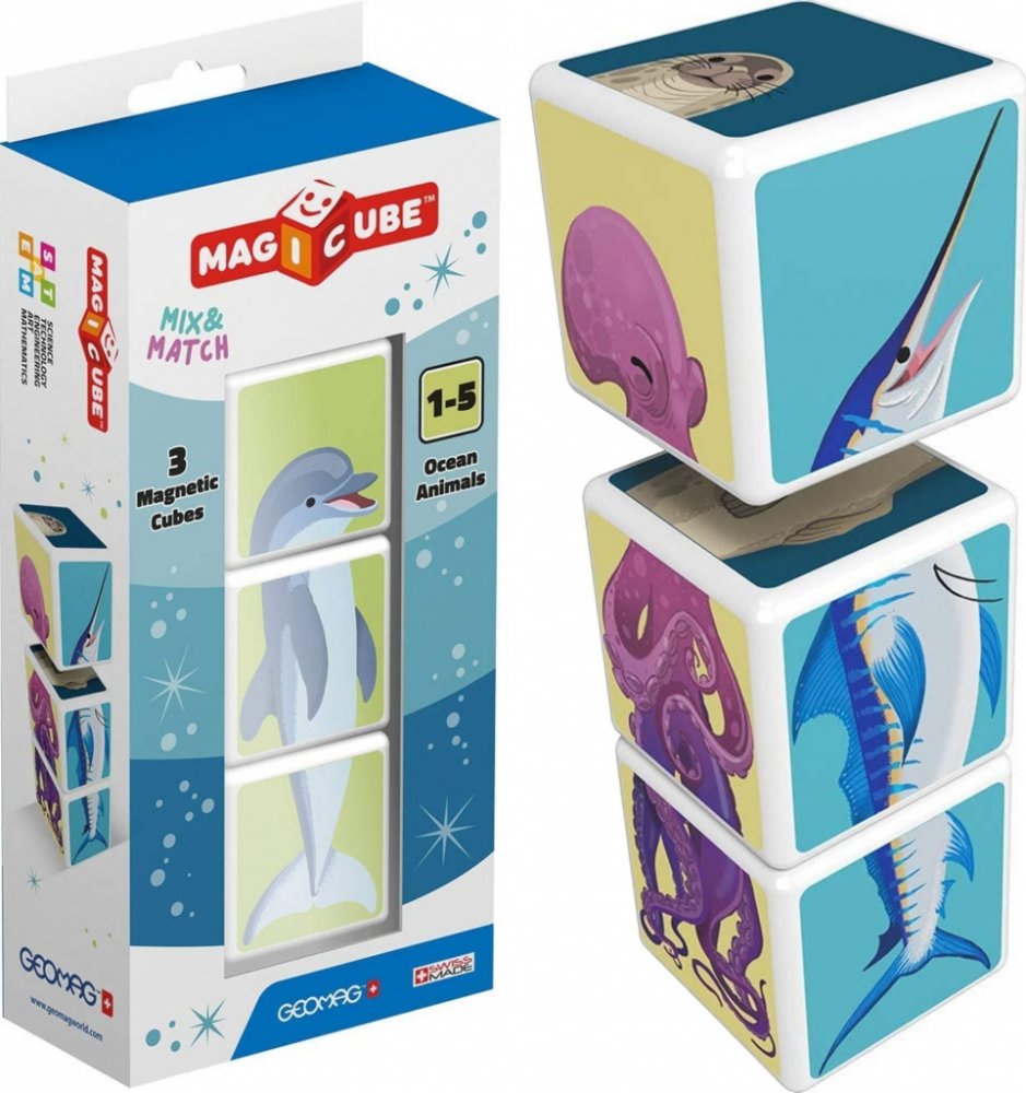 Nechte děti ponořit se do světa moří a oceánů a objevit jejich tajemství. Každá kostička tvoří jednu část těla. Nakonec se vynoří chobotnice, mečoun, tučňák, delfín, tuleň a žralok. Nebo snad nějaká jejich kombinace? Tohle bude děti bavit. Kostky jsou magnetické, děti z nich tedy mohou skládat trojrozměrné objekty.