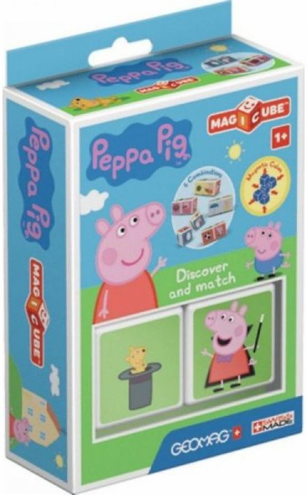 Krásné balení kostiček GEOMAG Magicube Peppa Pig discover and match. Díky magnetkům uvnitř kostek krásně drží v prostoru, stavění ve 3D!