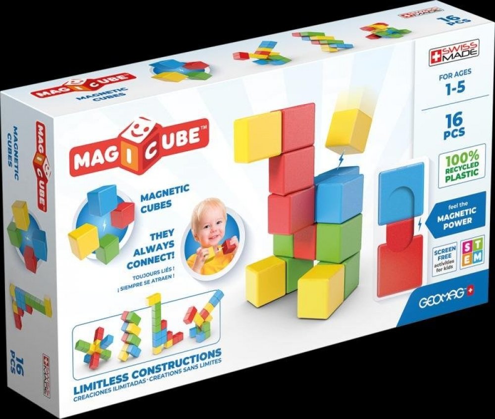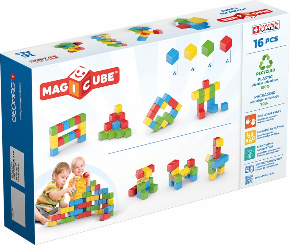 Magnetické kostky Geomag Magicube pro stavění objektů dle vlastní fantazie. Jsou skvělým doplňkem mnoha dětských her, kdy poslouží jako stáje pro koníky, ohrádky pro zvířata nebo třeba budovy, tunely a mosty k vláčkodráze. mají unikátní vnitřní konstrukci, díky které se kostky přitahují ze všech stranpodporují koordinaci a motorikurozvíjí fantazii a logické myšlenívynikající švýcarská kvalita S těmito kostkami Magicube má vaše dítě možnost prozkoumat síly magnetismu a zároveň se seznámit se světem designu. Kostky lze skládat do mnoha různých kombinací a dávají i těm nejmenším dětem příležitost rozvíjet své řemeslné dovednosti. Kostky jsou vyrobeny ze 100% recyklovaného plastu. Od 1 do 5 let. Testovací sada obsahuje: - 16 magnetických kostek Stavebnice Magicube Try Me 16 pcs vám nabízí možnost vyzkoušet magnetismus v praxi a zve vás do světa staveb vytvořených z našich magnetických kostek Geomag. Ty jsou vyrobeny ze 100% recyklovaného plastu, s respektem k naší planetě a životnímu prostředí. Stavební systém této inovativní hračky je tvořený magnetickými kostkami, které se k sobě navzájem přitahují ze všech šesti stran. Využitím neviditelných sil magnetismu mohou děti popustit uzdu své fantazie při vytváření barevných 3D modelů. Hrou s magnetickými kostkami si i ty nejmenší děti začnou rozvíjet své první manuální dovednosti, stavět věže i učit se barvy. Obsahuje 16 magnetických kostek ve čtyřech barvách. Vhodné pro děti již od 1 roku. Popis