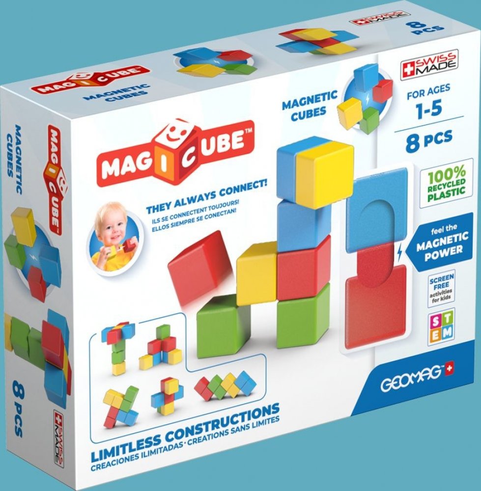 Stavebnice Magicube Try Me vám nabízí možnost vyzkoušet magnetismus v praxi a zve vás do světa staveb vytvořených z našich magnetických kostek Geomag. Ty jsou vyrobeny ze 100% recyklovaného plastu, s respektem k naší planetě a životnímu prostředí. Stavební systém této inovativní hračky je tvořený magnetickými kostkami, které se k sobě navzájem přitahují ze všech šesti stran. Využitím neviditelných sil magnetismu mohou děti popustit uzdu své fantazie při vytváření barevných 3D modelů. Hrou s magnetickými kostkami si i ty nejmenší děti začnou rozvíjet své první manuální dovednosti, stavět věže i učit se barvy.