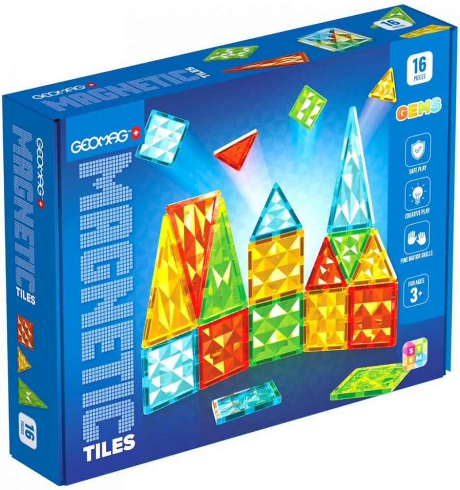 Geomag Magnetic Tiles 16 dílků obsahuje magnety na všech stranách jednotlivých tvarů. Lze tak snadno vytvářet jakékoliv 2D obrazce nebo 3D struktury. Stavebnice rozvíjí manuální zručnost, kreativitu a fantazii, učí barvy, geometrické tvary, ale hlavně si s ní děti užijí spoustu zábavy. Obsahuje 16 průhledných strukturovaných dílků ve čtyřech barvách – 8 čtverců, 4 rovnostranné a 4 rovnoramenné tro...