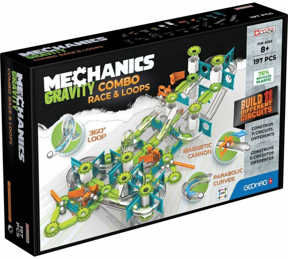 Postavte si vlastní gravitační dráhy a závody s kuličkami díky stavebnici GEOMAG Mechanics Gravity Combo. Z 197 dílků snadno vytvoříte až 11 různých okruhů s loopingy, zatáčkami a spouštěči. Hračka z recyklovaného plastu, vyrobená ve Švýcarsku, zábavnou formou rozvíjí logiku, kreativitu a pochopení fyziky. Vhodné od 8 let.