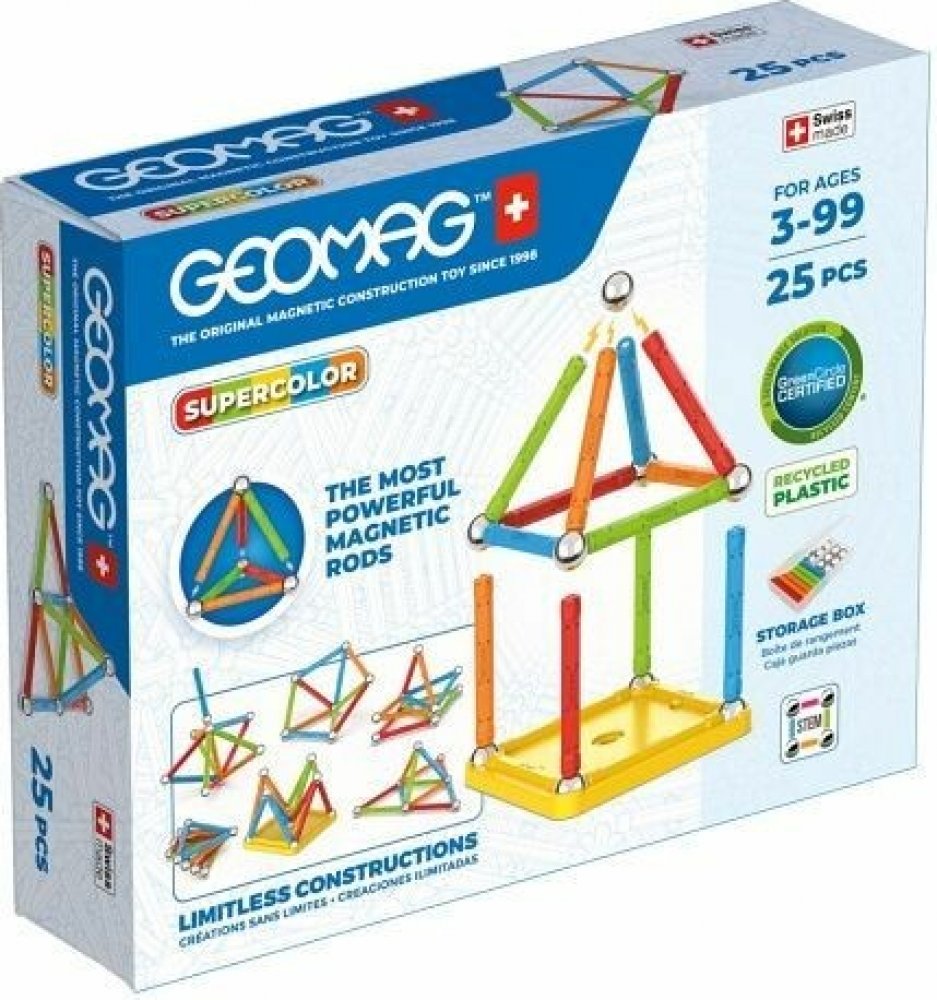 Magnetická stavebnice Geomag Supercolor obsahuje 12 magnetických tyček různých barev, 12 ocelových kuliček a 1 čtvercový podstavec, celkem 25 dílků. Všechny plasty použité pro potahy tyček a podstavců jsou ze 100% recyklovaného materiálu a jejich dokonalé barvy potěší i ty nejnáročnější. Součástí balení je navíc praktický úložný box – máte tak možnost mít stavebnici pořád u sebe a navíc přehledně srovnanou v kapesním balení. Vyrobeno ve Švýcarsku, z recyklovaného plastu, vhodné od 3 let.