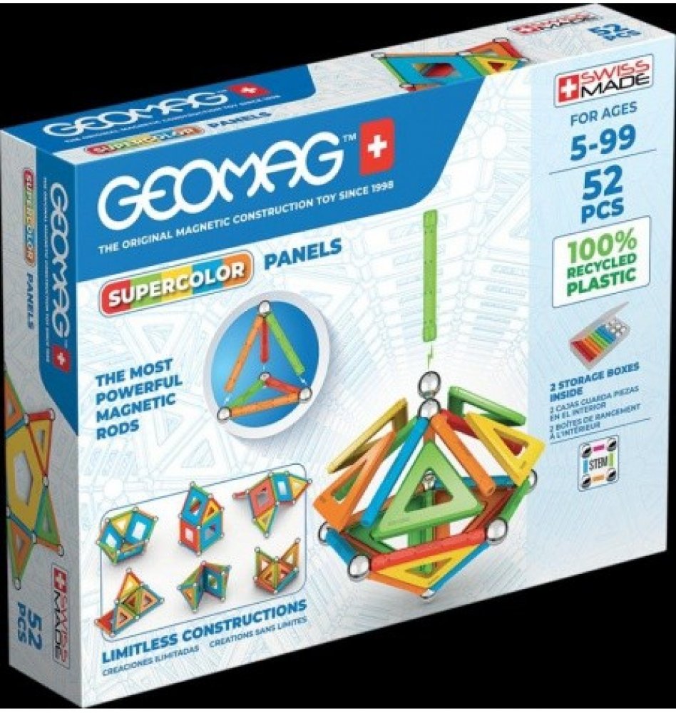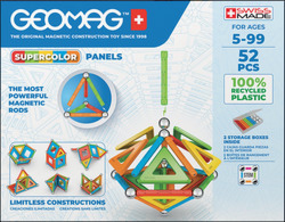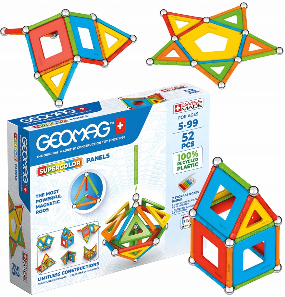 Nová řada stavebnice GEOMAG Supercolor Panels je tvořena jedinečnou kombinací pastelových barev tyčinek a výplní. Všechny plastové části jsou vyrobeny ze 100% recyklovaného plastu. Geomag myslí na budoucnosti našich dětí i na budoucnost naší planety. Obsahuje: 16 x ocelová kulička potažená bílým bronzem 2 x výplň - pětiúhelník 8 x výplň - čtverec 10 x výplň - trojúhelník 16 x magnetická tyčinka 5,7 cm GEOMAG je švýcarská konstrukční stavebnice, která umožňuje stavbu nejrozmanitějších tvarů, objektů a obrazců. Základním stavebním prvkem jsou magnetické tyčinky s plastovým nebo fosforovým potahem a poniklované kuličky o průměru 12,7 mm. Další prvky stavebnice jsou základové desky a dělící plastové panely (výplně). Stavebnice GEOMAG lze využít nejenom na hraní, ale i jako atraktivní učební pomůcku ve školách. GEOMAG podporuje tvořivost, představivost, jemnou motoriku a kombinační schopnosti. Stavebnice GEOMAG je vyrobena s švýcarskou přesností, v souladu s nejpřísnějšími mezinárodními kritérii kvality a bezpečnosti , je zdravotně nezávadná a má vynikající odolnost proti opotřebení.