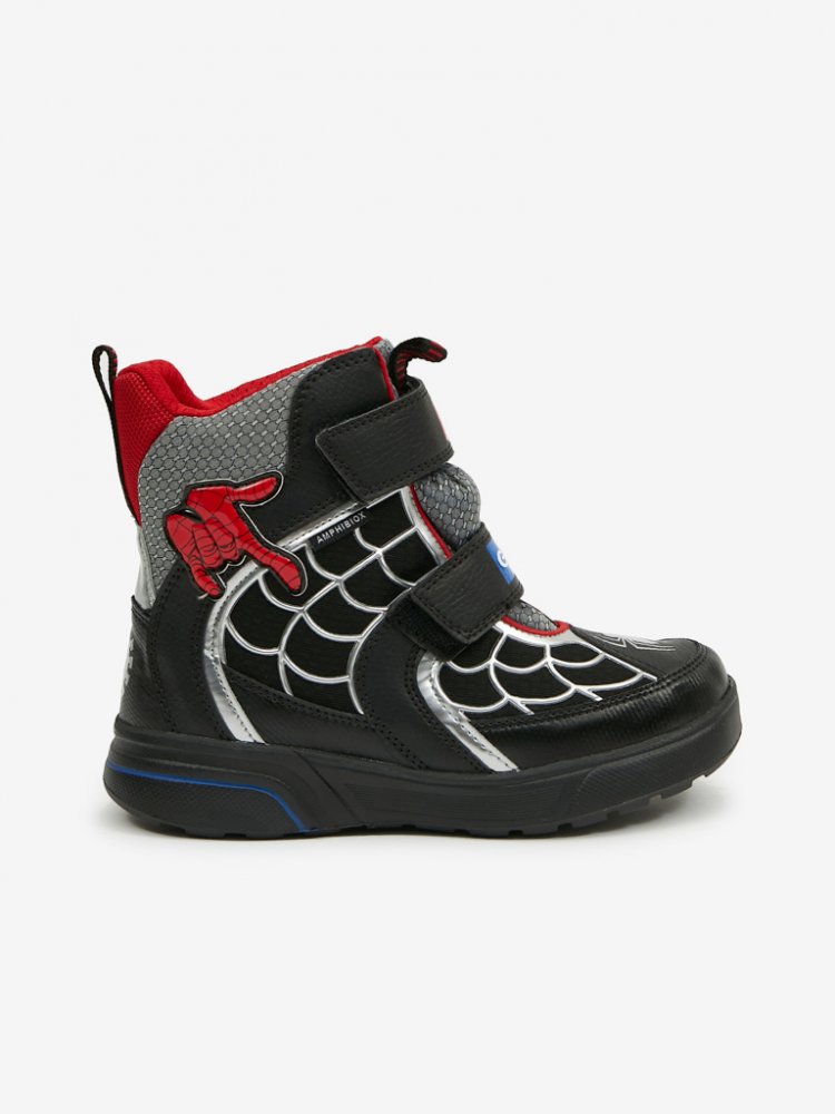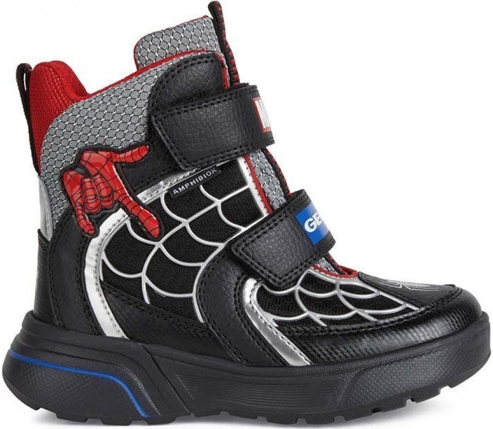 Juniorské hybridní kotníkové boty s příjemnou voděodolnou strukturou navržené s ohledem na malé fanoušky Spider-Mana. Sveggen ABX je dokonalým řešením pro chladné nevlídné počasí a je vyroben z materiálu s efektem kůže a tkaniny v černo-červené barvě. Produkt partnerství mezi Geox a Marvel, zajišťuje vysokou úroveň pohodlí a ochrany a spočívá na inovativní ultralehké a flexibilní podešvi.