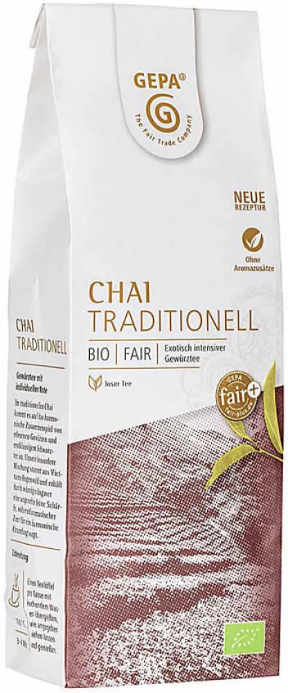 Změna barevného stylu šablony pro potraviny Černý čaj s kořením Fairtrade Gepa BIOSypaný, 100 g Německá společnost Gepa je jednou z nejznámějších organizací v oblasti Fair Trade, která usiluje o pomoc producentům v zemích třetího světa a také je největším dovozcem a distributorem certifikovaných výrobků. Černý čaj pochází z Indie a je doplněn kořením ze Srí Lanky. Nejlépe chutná se třtinovým cukre...