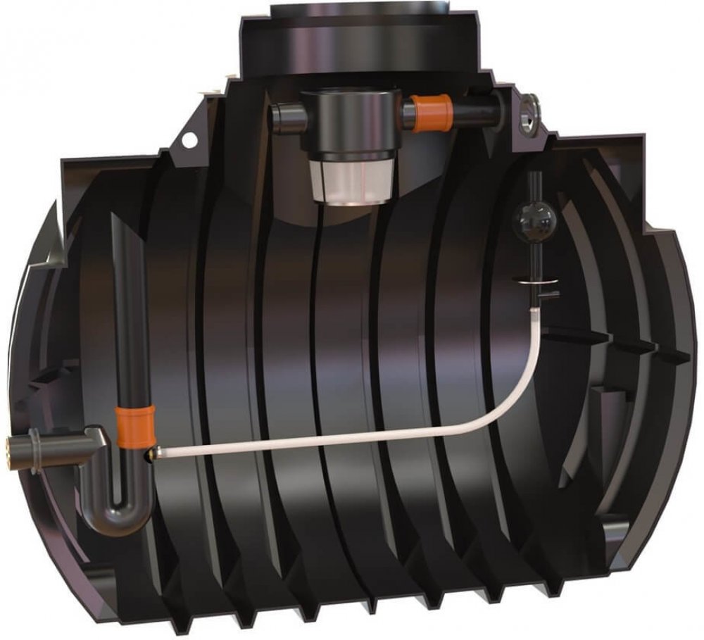 Záchytná nádrž 4000 litrů s dodatečným využitelným objemem pro použití na zahradě včetně předinstalovaného zahradního filtru, nouzového přepadu a retenčního ventilu.
