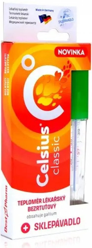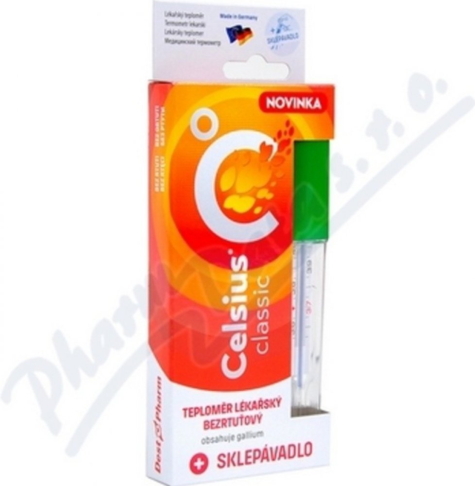 Celsius NEW je lékařský bezrtuťový skleněný teploměr. Měření je přesné na 100%. Zároveň je hygienický, čímž nedochází k přenosům virů. Není vyroben z plastů, jedů či baterie, což je důkaz jeho ekologičnosti. Balení obsahuje navíc sklepávadlo, které slouží ke snadnějšímu sklepání sloupce naměřené teploty.