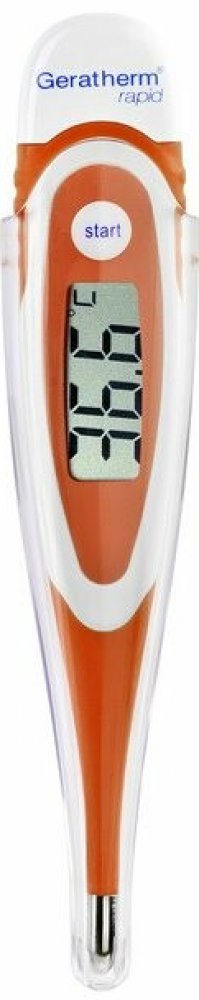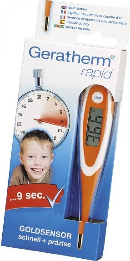 Extra rychlý a přesný digitální teploměr Geratherm Rapid s ohebným koncem a extra velkým LCD displejem je použitelný pro celou rodinu. Teploměr je díky pozlacenému čidlu antialergický, má akustický alarm v případě horečky, funkci automatického vypnutí a je voděodolný. Automaticky ukládá poslední naměřenou hodnotu do paměti teploměru.
