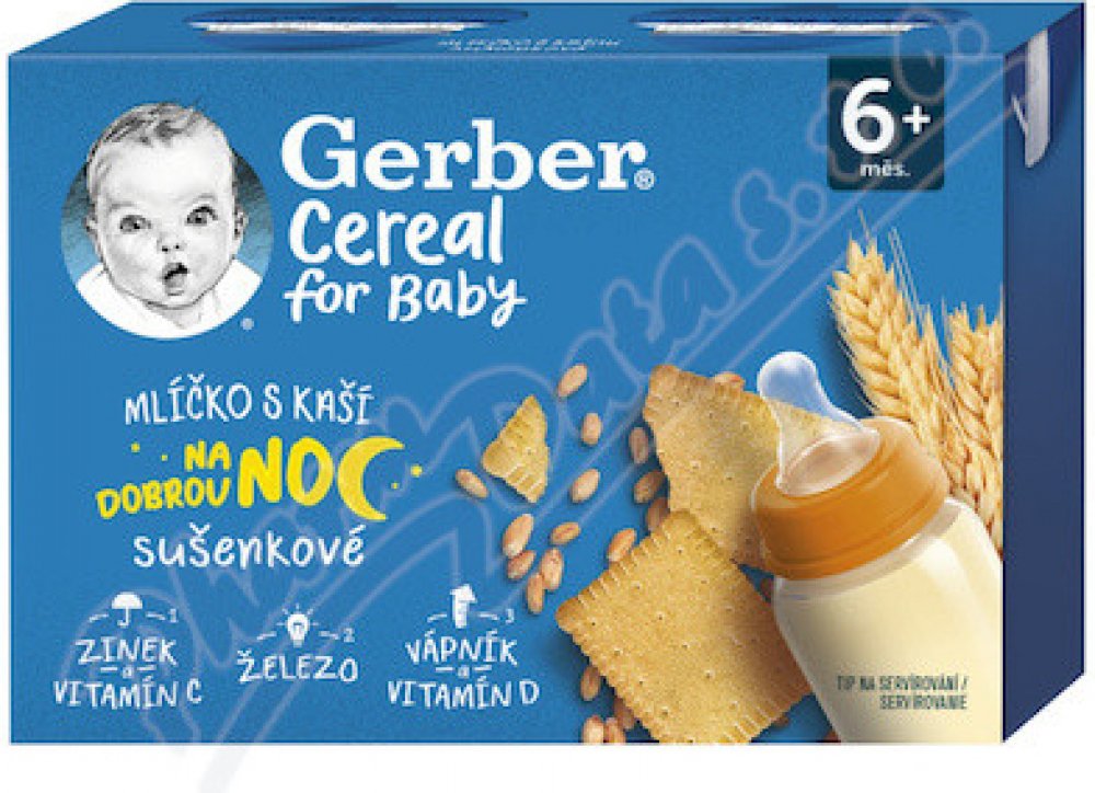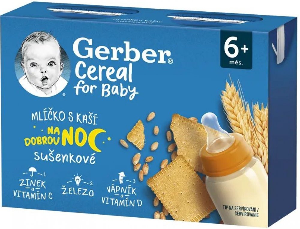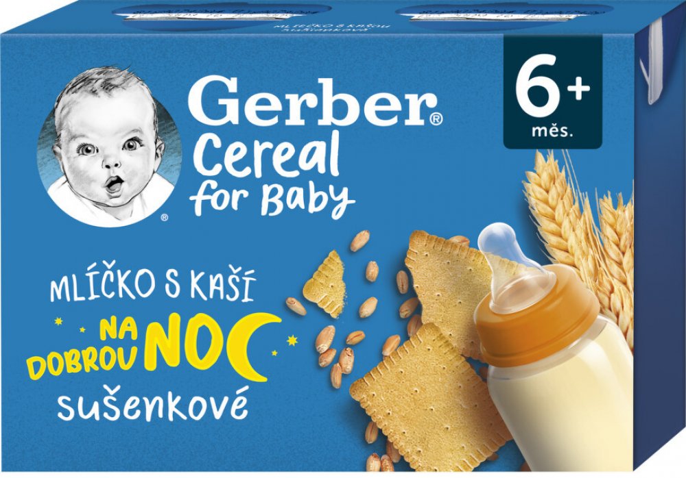 GERBER Cereal mlíčko s kaší sušenkové 2x200 ml. Hotový mléčno-obilný příkrm s drcenými sušenkami pro kojence od ukončeného 6. měsíce.