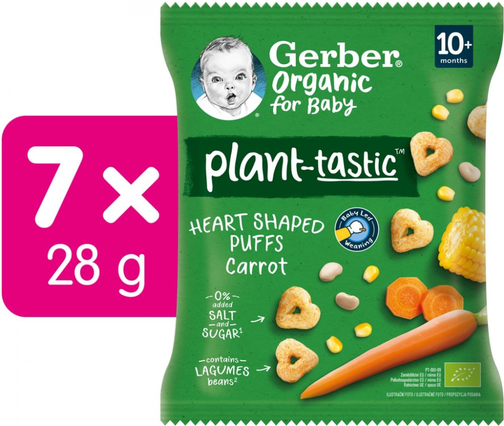 GERBER Organic křupavá srdíčka s mrkví Každá porce křupavých srdíček GERBER Organic přináší do pusinky malého mlsouna až 5 g obilovin pocházejících z organic farem, kde je brán ohled na přirozený způsob pěstování všech plodin. Sladká mrkvička pak dodává křupkám jejich výjimečnou chuť.Křupky podporují samostatnost dětí při jídle. Svým tvarem perfektně padnou do drobných ruček a díky své jemné textuře se snadno rozpustí v pusince malého jedlíka. Dětské křupky poslouží jako praktická svačinka nejen na doma, ale i na cesty. Od uk. 10. měsíce Vhodné od 7× 28 g Velikost balení Křupky Typ příkrmu Klíčové vlastnosti křupek GERBER Organic křupavá srdíčka s mrkvíSkvělá kombinace obilovin, luštěnin a zeleninyIdeální tvar pro malé ručičkyPodpora samostatnosti při jídleNapomáhají rozvoji jemné motorikPečlivě vybrané obiloviny z ekologických faremBez přídavku soliBez přidaného cukru...