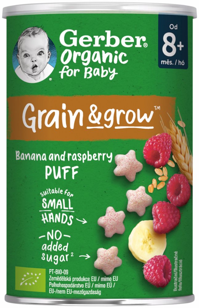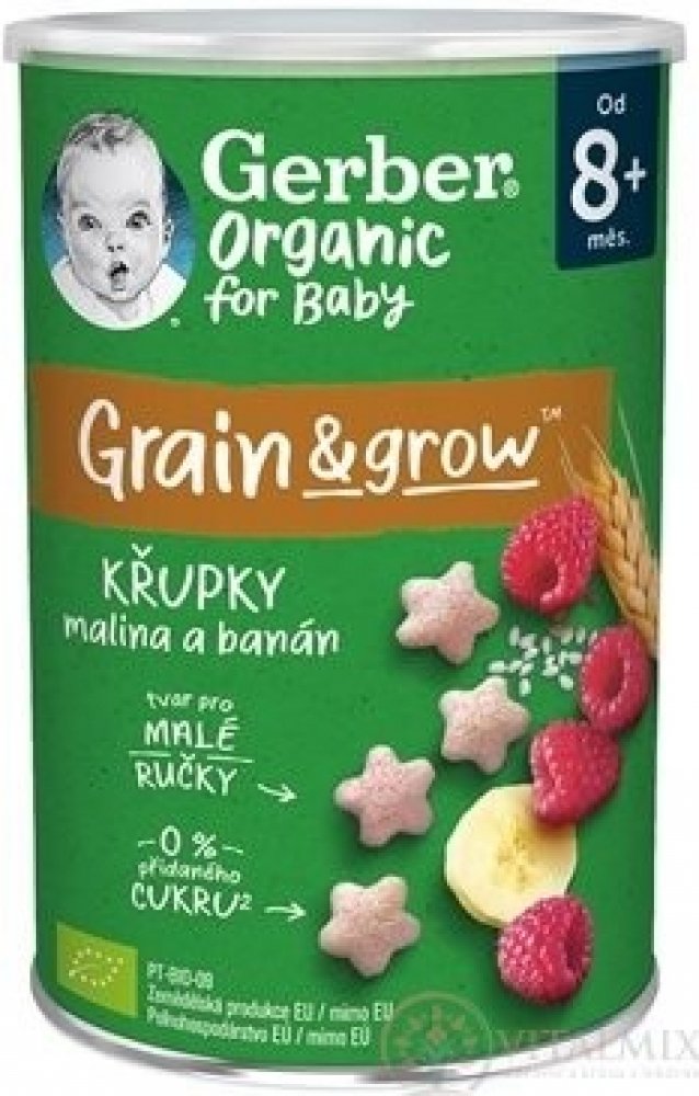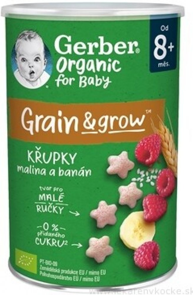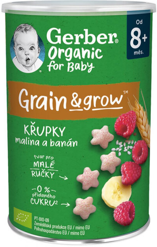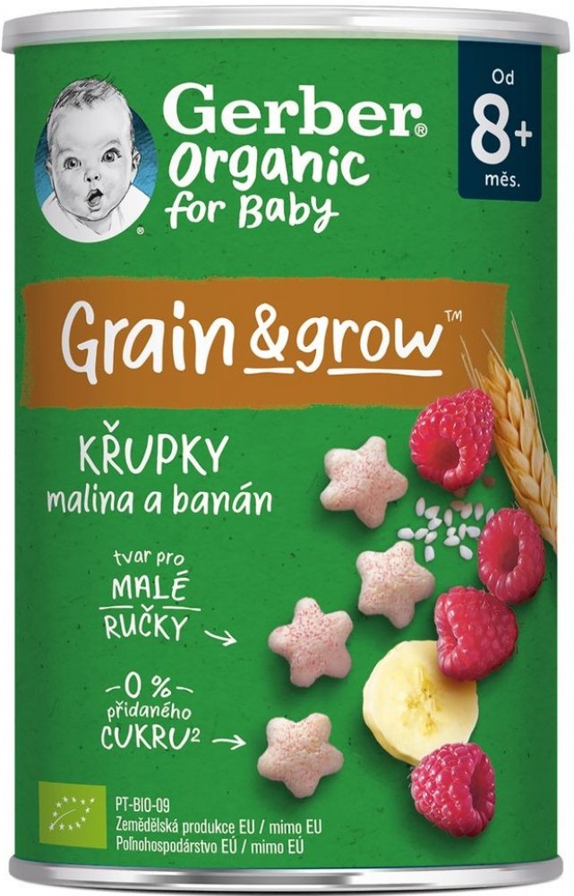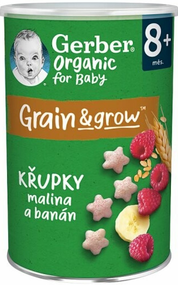 GERBER Organic křupky s banánem a malinami jsou křehké a nadýchané křupky pro malé děti vhodné od ukončeného 8. měsíce. Křupky jsou speciálně navrženy tak, aby odpovídaly potřebám vašich ratolestí. Skvěle padnou do ruček malých strávníků a pobízí i ty nejmenší k samostatnosti při jídle. Hravý tvar skvěle padnoucí do malých ruček vede k rozvoji jemné motoriky.